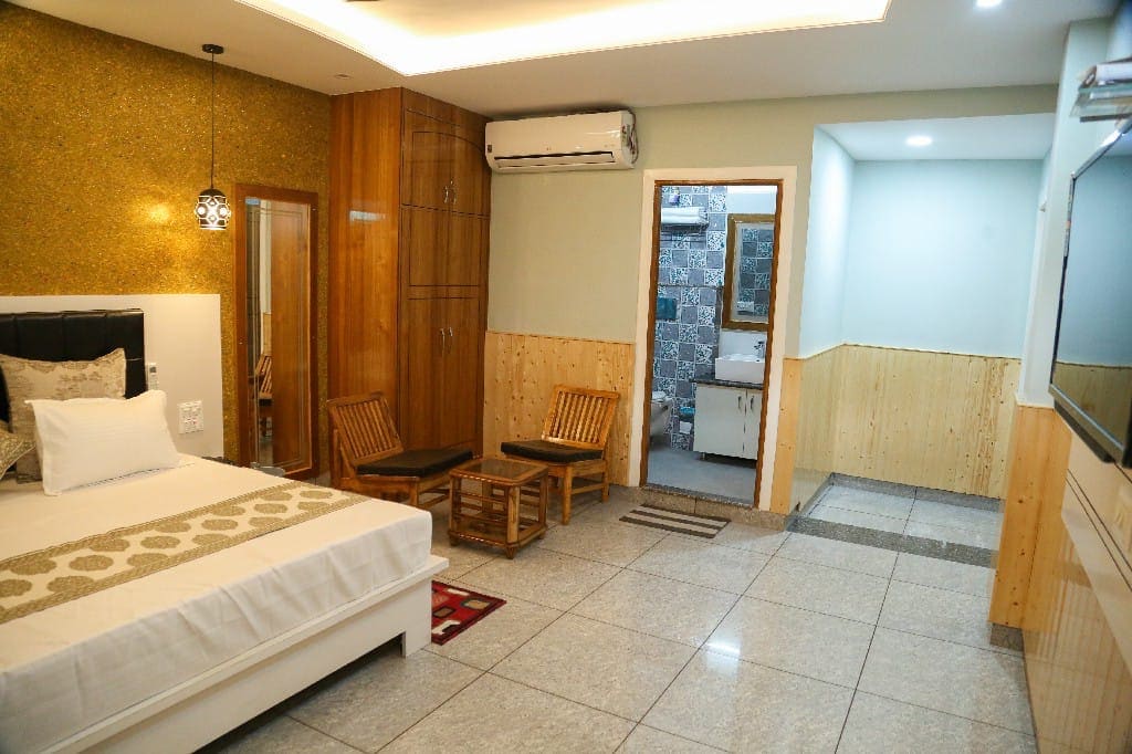 A spacious 1 BHK family suite in Kasauli, offering a cozy bedroom, comfortable living area, modern bathroom, and a private balcony with serene pine-hill views. Ideal for families, couples, and peaceful mountain getaways.