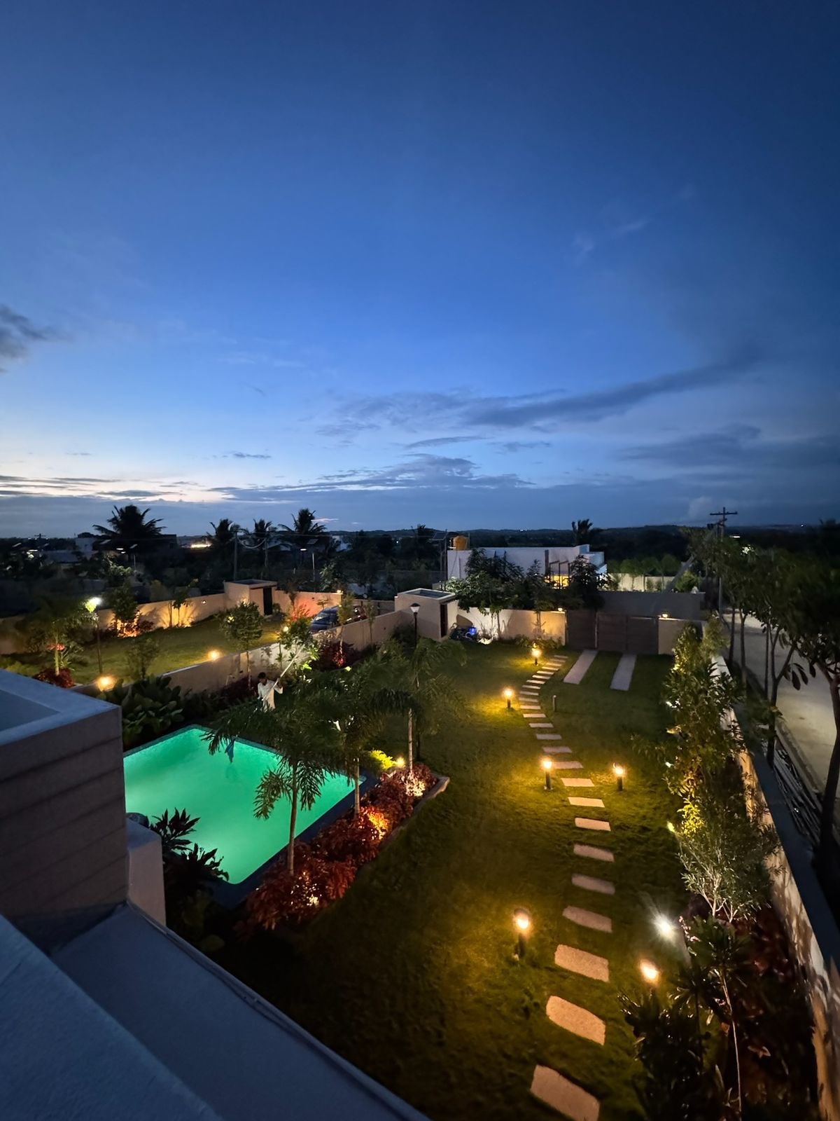 Discover EL Palm House: a tranquil oasis near the city's IT hub. 10min from RGA Tech park. 15min from RMZ Eco World. This independent home in a serene layout features a lush lawn, backyard, plunge pool, fully equipped kitchen. OUTDOOR SHOWER AREA (covered yet outdoor) Embrace the tropical vibe surrounded by palm plants. Experience the harmony of city life and nature's embrace at EL Palm House, where every moment is an invitation to relax and rejuvenate.