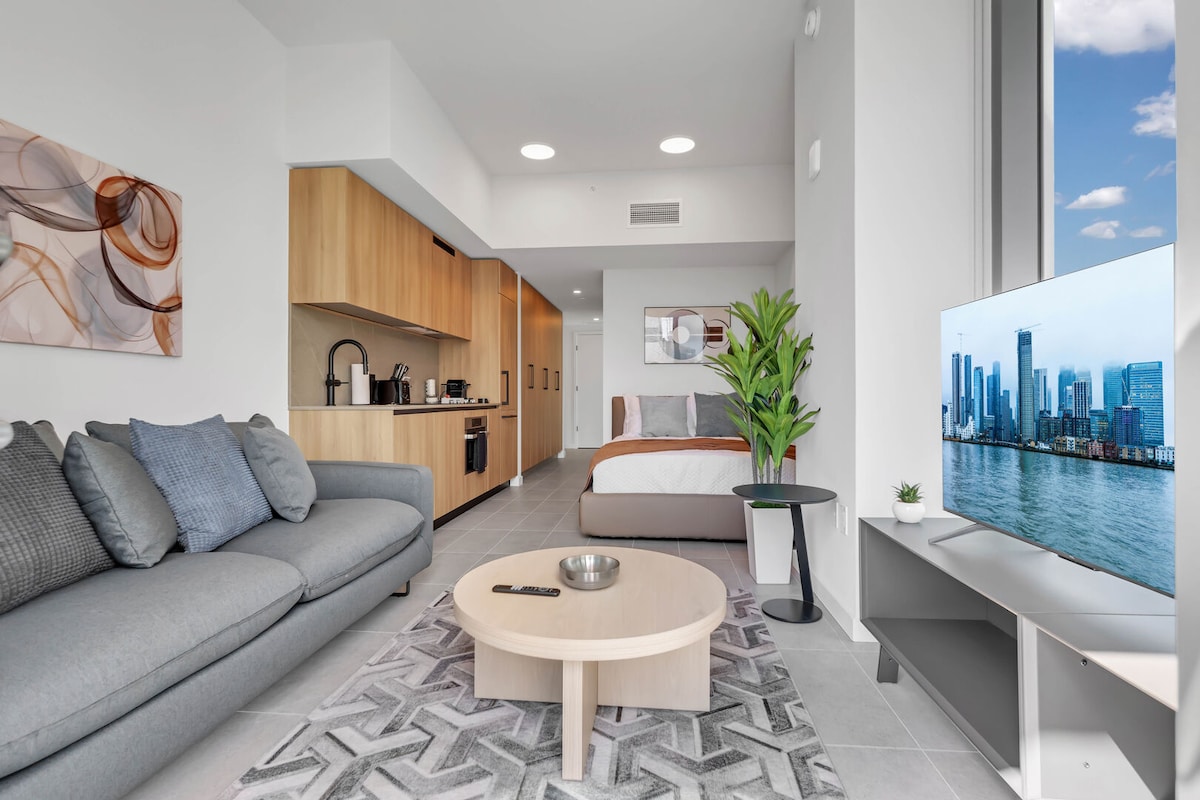 Modern Miami Studio with stunning views! Enjoy a cozy space with a King Size Bed, Smart TV, fast WiFi, and a private balcony. Perfect for relaxing after exploring the beach, nightlife, and top dining spots nearby. Located across the street from Bayside Marketplace Waterfront. Includes a kitchenette, central AC, and secure building access. Ideal for solo travelers or couples seeking comfort and style in the heart of Miami. Book your escape today 🌴