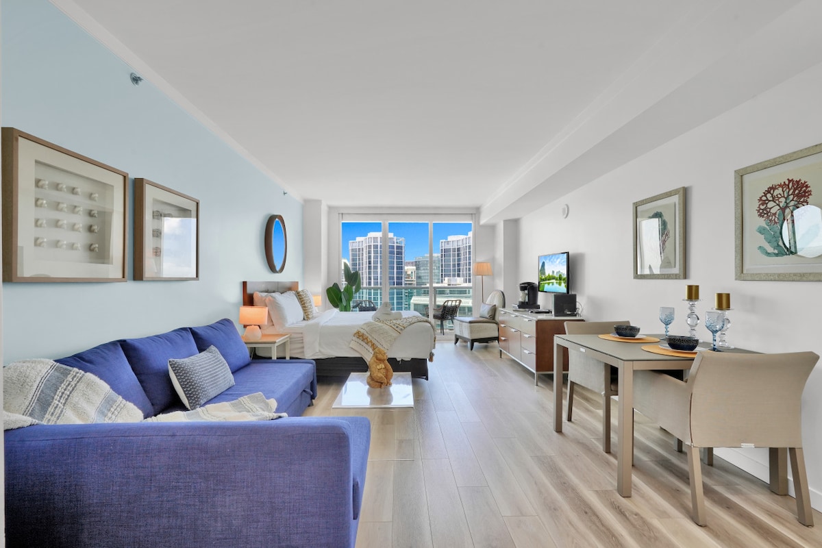 Step into sophistication at this stunning high-rise luxury studio in the heart of Miami. Perched above the city’s skyline, this sleek and luxury retreat offers panoramic views of the city and the vibrant downtown lights. Whether you’re here for business, romantic escape or a family getaway, this centrally located studio offers the perfect mix of comfort, convenience, and Miami energy.