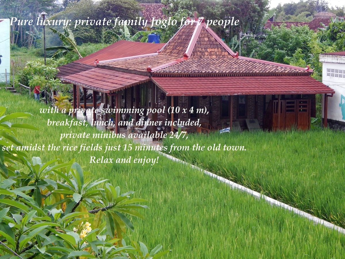 A small bungalow from teak wood of old Javanese house located in a village 20 minutes from the City Centre. The bungalow is in the back yard of "Rumah Jambon Village House" in a quiet surrounding, and it's perfect for those who want to write or read or just escape from hectic-crowd routines. Guest can wander around the village through rice field and also irrigation canals. The bungalow has a bathroom with hot shower, air conditioner, terrace and garden.