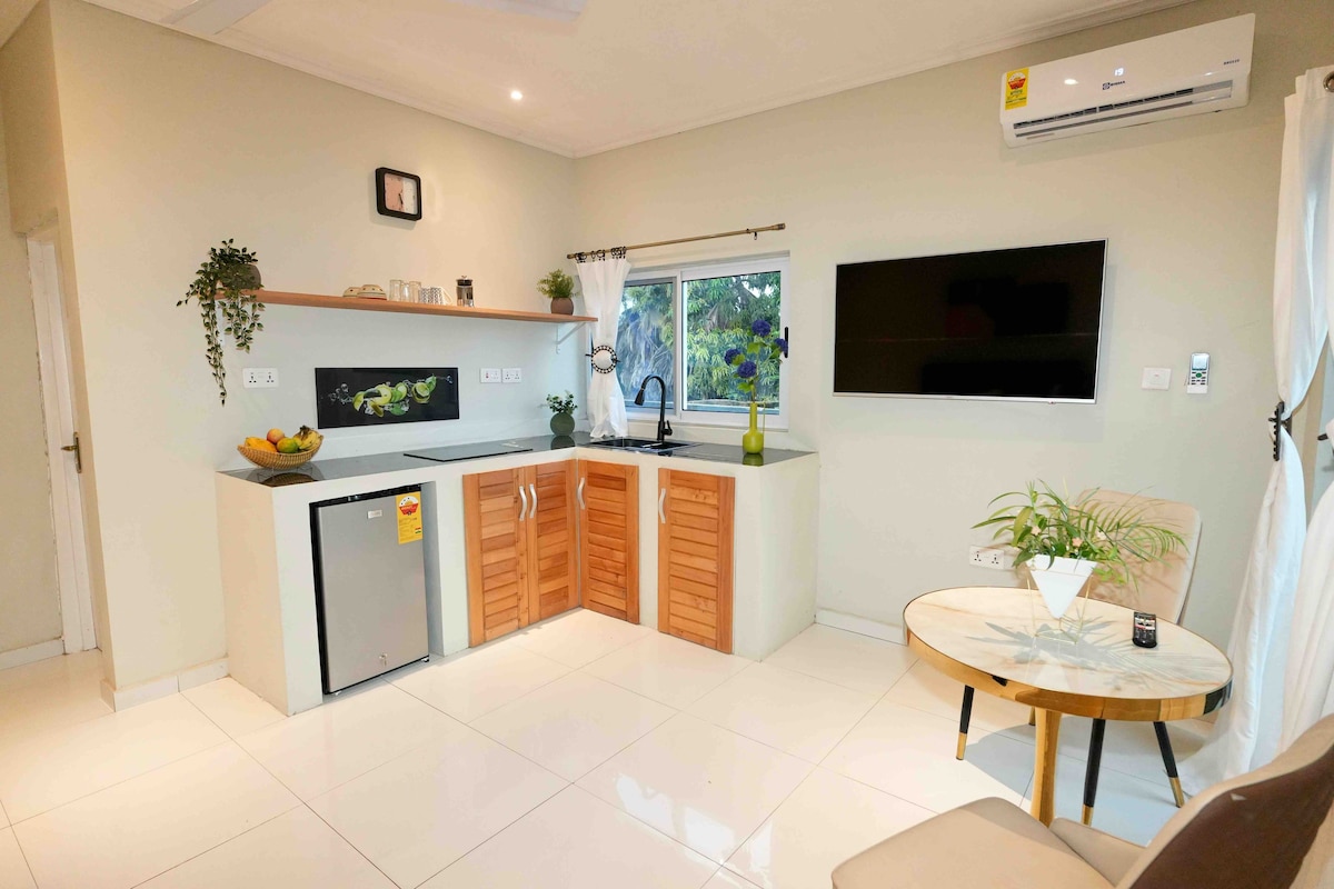 Take it easy at this unique and tranquil getaway studio apartment located within the prime and secured Cantonments area near the US embassy. Excellent location; 7 mins from Kotoka International Airport and within 10min radius from the city's major shopping centers and restaurants. It offers guests a cozy feel from the inside and breathtaking serene view of the pool and beautiful garden. This newly furnished 2nd floor studio is designed to cater for business, leisure & long stays.