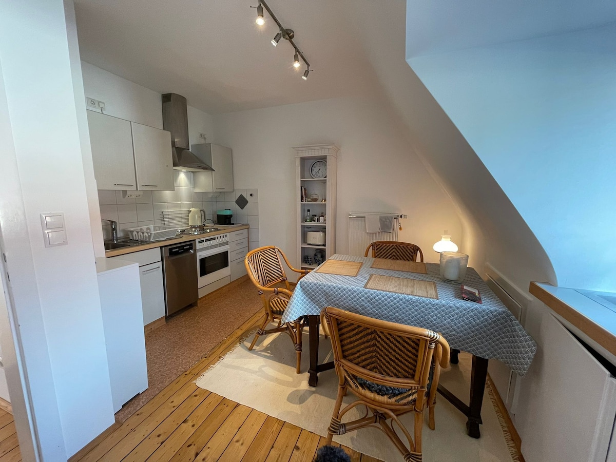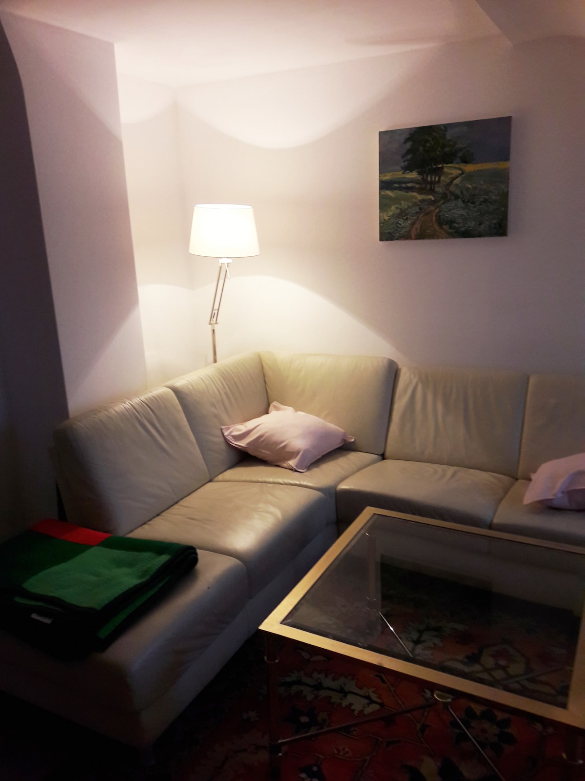 Das schöne modern eingerichtete 1-Zimmer-App. verfügt über einen sep. Hauseingang, ein großes Bett (140x200 cm), Sofa, weißen Ikea-Kleiderschrank, Esstisch, mit 2 Stühlen, Flachbild-Fernseher, Küche mit Mikrowelle (Heißluft), Kaffeemaschine, Tchibo Cafissimo, Toaster, Wasserkocher, Geschirr, Bad, Dusche, Spiegelschrank, Waschbeckenunterschrank, Internetverbindung, elektrische Rolladen in Wohn/Schlafraum und im Bad. Ein Föhn,Handwaschseife, Shampoo, Handtücher und Bettwäsche wird gestellt.