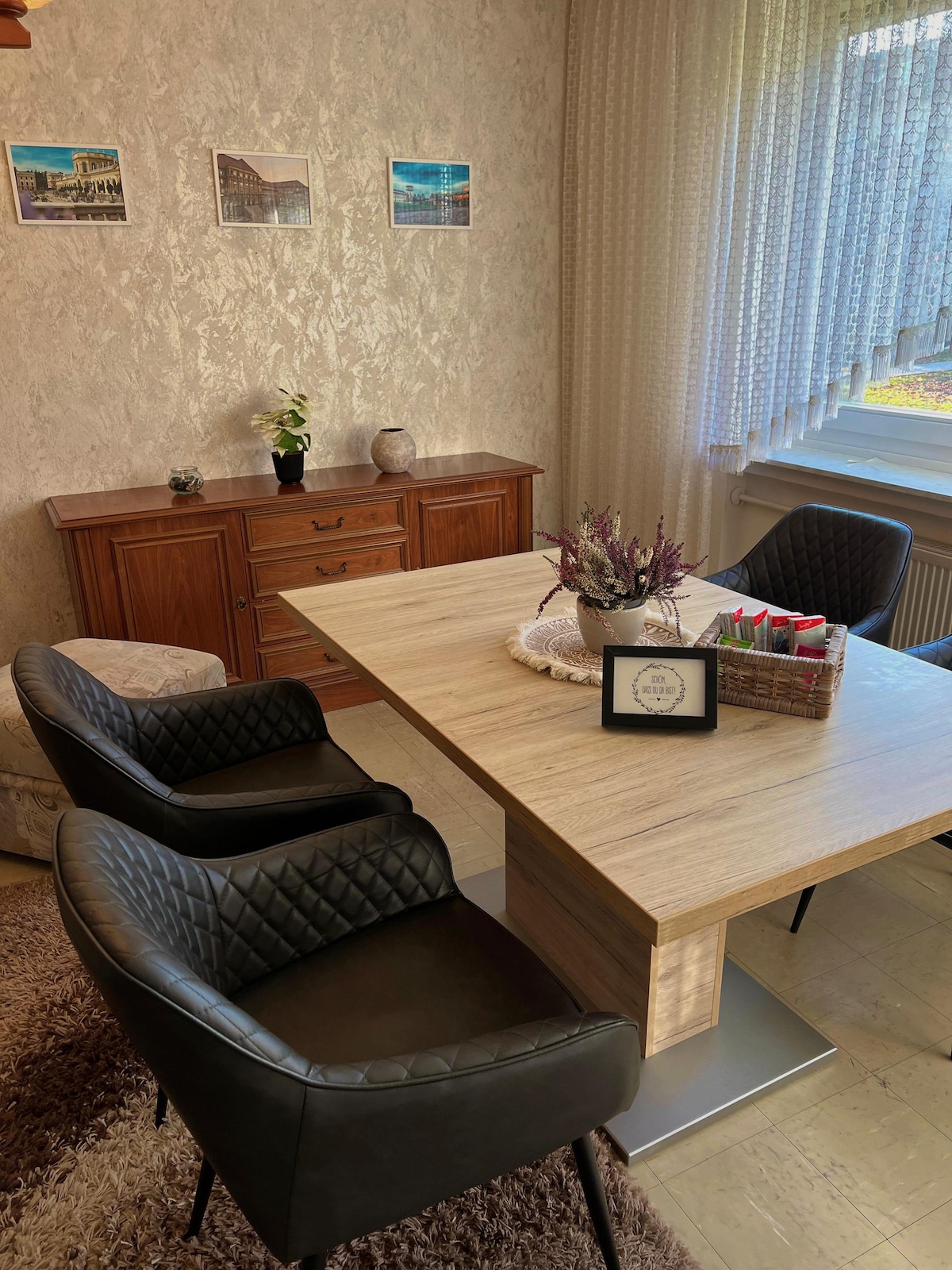 Hallo, liebe Gäste! Hiermit bieten wir eine sehr ruhige und gemütliche 3- Zimmer-Wohnung, die sich im 2. OG /Dachgeschoss eines 2 Familien Hauses befindet und über die Treppe von einem gemeinsamen Eingang aus zu erreichen ist. Die Wohnung beinhaltet 3 Zimmer: ein Schlafzimmer mit einem großen Doppelbett, ein Arbeitszimmer, wo noch ein zusätzliches Bett steht, ein Wohnzimmer, eine Küche und ein Bad . Die Anbindung in die Stadtmitte ist sehr gut, ca. 10min mit der Bahn. Parken problemlos.