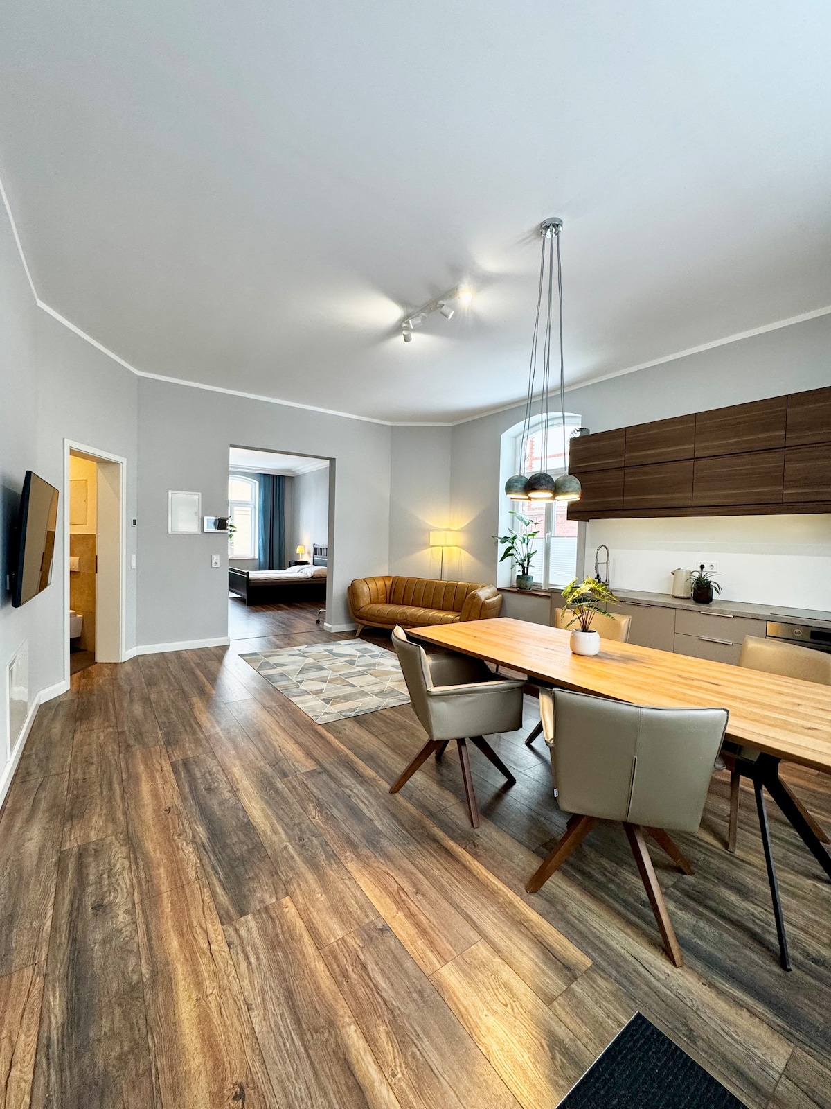 Spacious, bright old building apartment with architectural details such as high ceilings and exposed brick. In the Philosophenweg in Kassel, quietly located and yet very central, just a 5-minute walk from the beautiful Karlsaue. The apartment has a large living room with dining area. Three cozy bedrooms. A corner bathtub with rain shower, a fireplace and a small terrace are available for our guests. Well suited for families and nice meetings with friends.