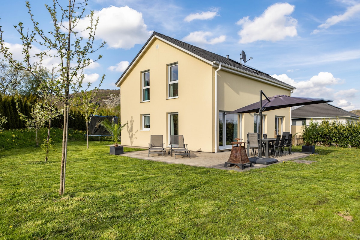 Villa Sunshine in Niedenstein welcomes you with 144 m² of space, accommodating up to 10 guests in 5 bedrooms and 2 bathrooms. The ground floor offers a bathroom with toilet and shower; the first floor has a bathroom with toilet, shower, and bathtub. The fully equipped kitchen includes a fully automatic coffee machine. High-speed Wi-Fi is perfect for video calls, and a dedicated workspace is available. For families, there is 1 baby cot, 1 high chair, as well as shared toys and children's books.