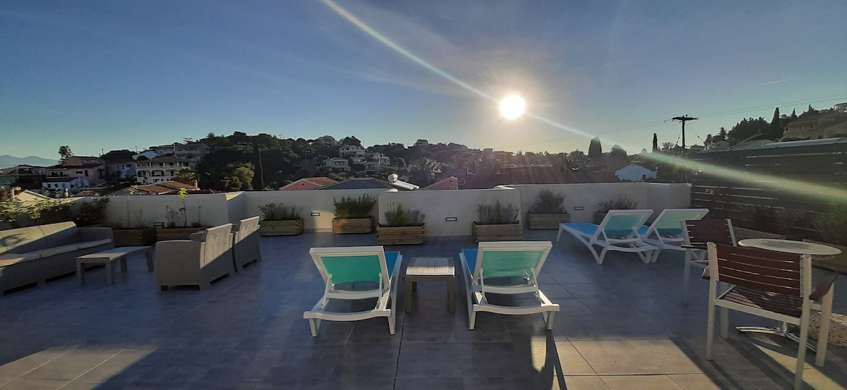 This accommodation has its own style. It is an exclusive penthouse with a fantastic view of the Ionian Sea and the north of the island of Corfu. The penthouse apartment is equipped with two bedrooms with starry skies, 2 bathrooms each with a shower, a washer-dryer, an exclusive kitchen with Miele built-in appliances. The apartment also has a great Sonos sound system, many LED color light functions and a large whirlpool with daily sunsets.