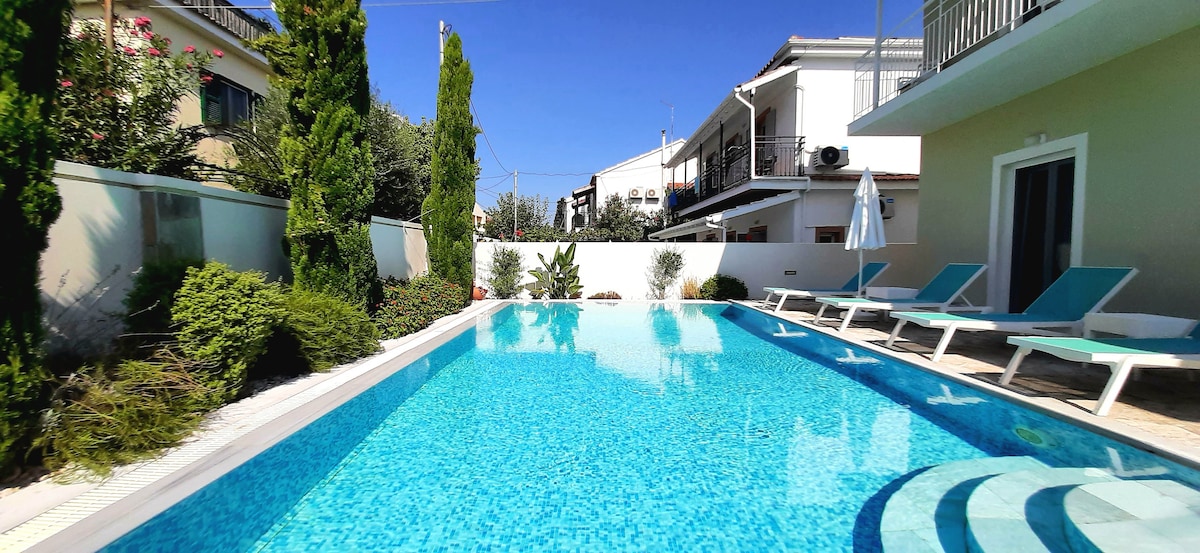 The Central Suites, Kassiopi consist of four apartment suites situated within a mere 3 minute stroll of Kassiopi centre in a quiet neighborhood inhabited by few village locals. 6 minute flat walk to Kassiopi’s main beach. Each apartment suite boasts 2 bedrooms (sleeps 4), large private balcony, bathroom and kitchen. Fantastic common area features including a good size communal pool, lounge area and communal BBQ, plus shared laundry facilities.