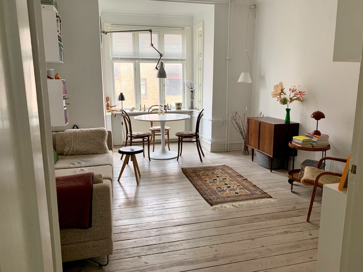 The apartment is located in inner Copenhagen in the middle of the vibrant shopping district. It is facing the courtyard, but with an open window you can still hear the rich city life in the background The neighborhood is filled with cafes, bars and shopping opportunities. The famous street "Strøget" is an arms length from the apartment, and runs through the entire midtown. It is perfect for a couple. It has a 200 x 180 bed in the bedroom and a new sleep sofa.