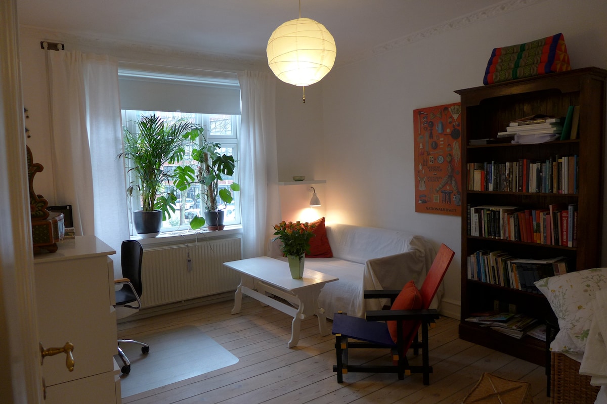 Stay like a local in my cosy 2-room apartment in central - yet quiet - Amagerbro. Postive features: - Close to the city center, the beach, the airport and public transport. - Bright apartment at the top, 5th floor - No cleaning fee (I know you'll take good care of my home ;) To consider: - No elevator and 97 steps top the top floor - Typical Copenhagen bathroom - small but functional