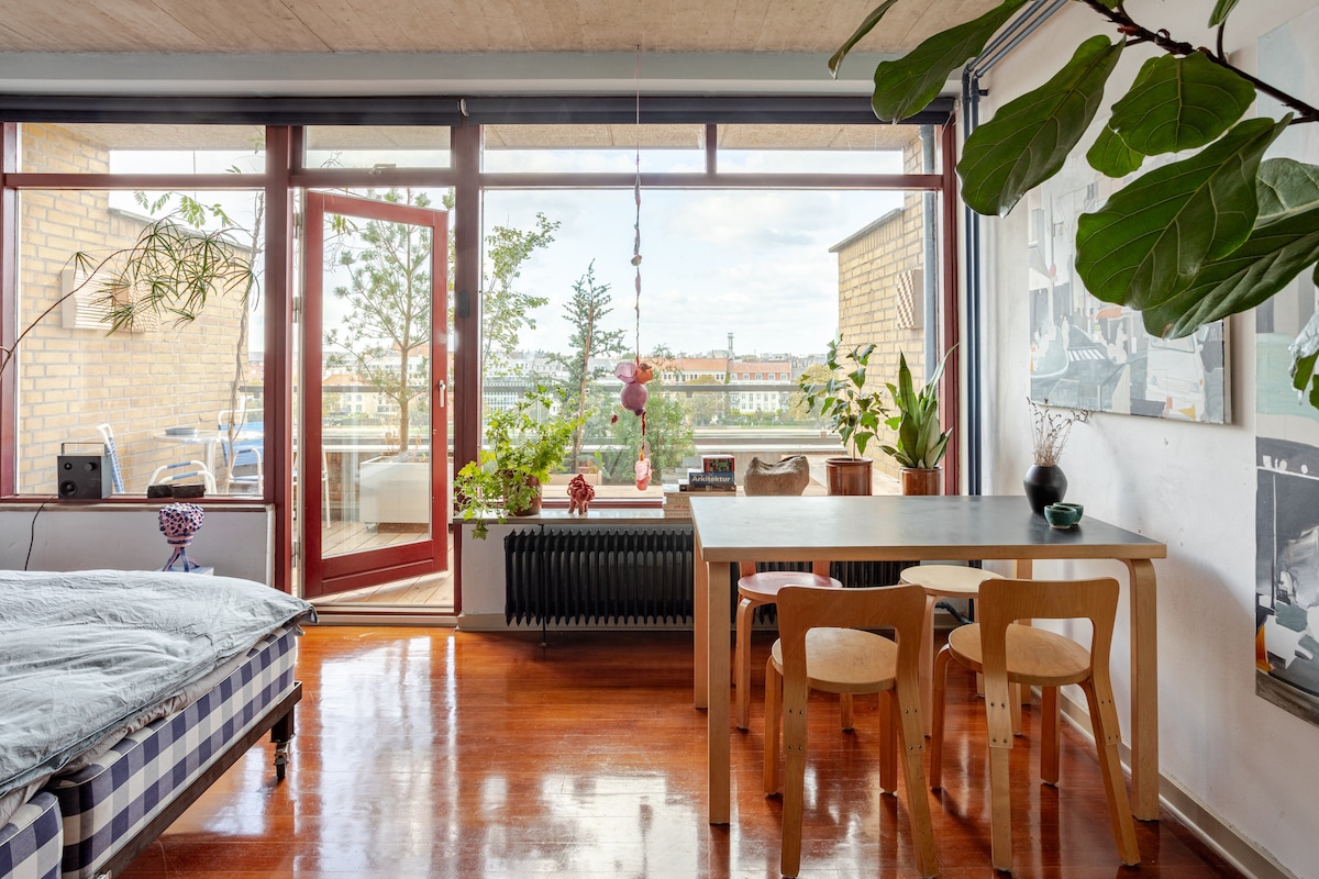 Enjoy Dwell mag featured Søboks: a restored inner city flat for 1-or-2 located above Copenhagen's beloved lakes. Uniquely partnered with local gallerist, Nordvaerk, experience emerging Danish artists while you stay. Watch sunrise and set from the garden-filled terrace overlooking the city. Steps away from top museums, galleries, charming restaurants, boutiques, and cafes. Picinc in lush green parks nearby. Caring 'superhosts' of many years-available for Copenhagen queries on demand. Tusind Tak!