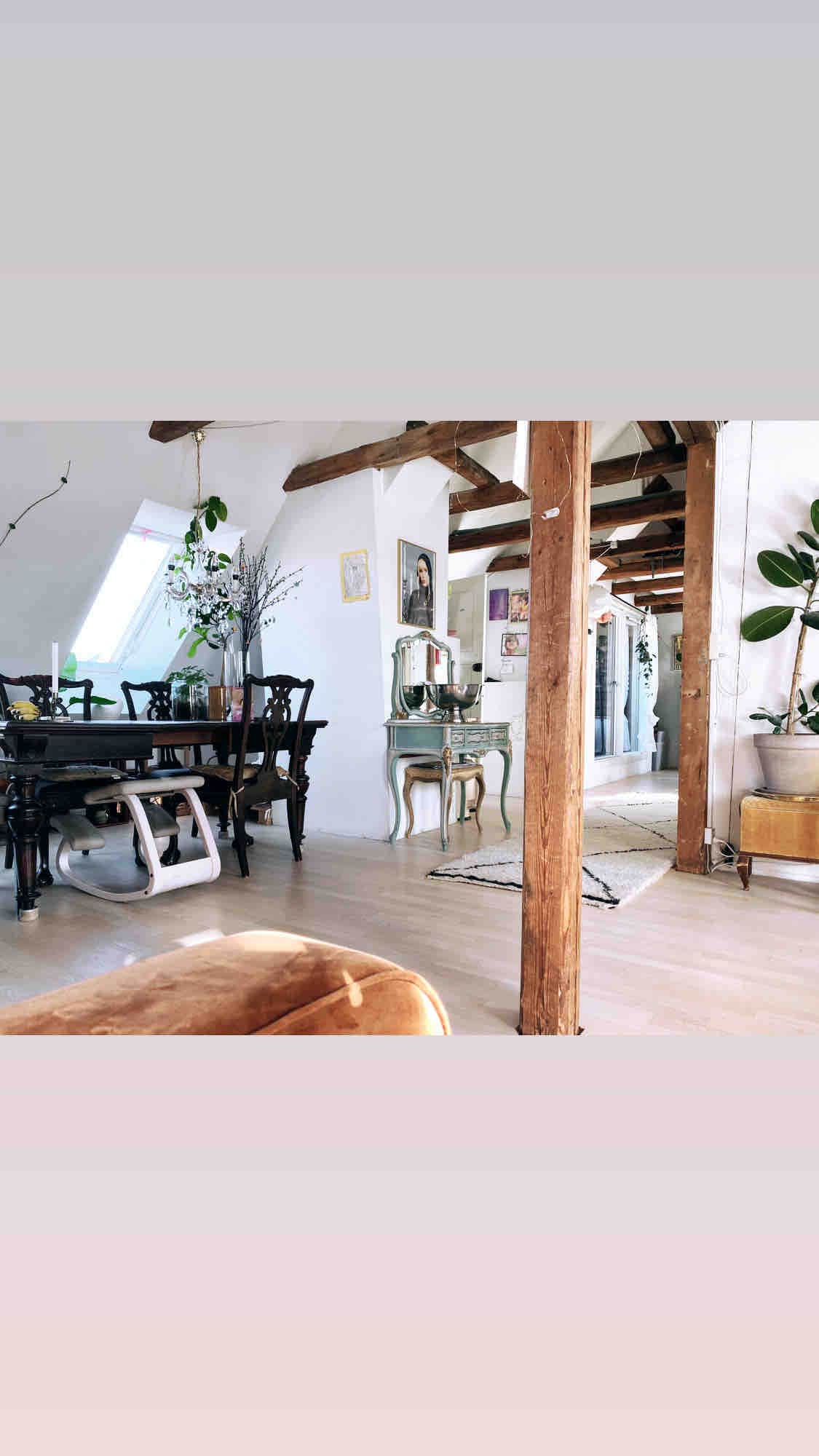 The loft apartment is 1100 SF, it is very sunny and very bright. Exposed wooden beams and 4, meters to the ceiling. At the loft apartment you have your own Private Enterance Hall, Two lounges, Bath tub, seperate shower corner, vintage marble-stoned Bathroom and a spacious private roof terrace with french sunchair from Lafuma, flowers & furnitures. Huge smart TV. Two Danish Design Sofas.