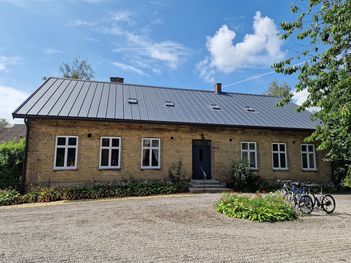 Welcome! Loft apartment of a house more than a 100 years old by the church in Flädie, a quiet and peaceful village close to the western coastline of Skåne. Surrounded by a beautiful, private garden and colorful scanian fields in the spring and summer. Spacious and bright interior with 6 bedrooms, 2 living rooms and 2 bathrooms, one of which has a washing machine. Fully renovated in 2023. Convenient parking right outside the main entrance with enough space for 5 or more cars.