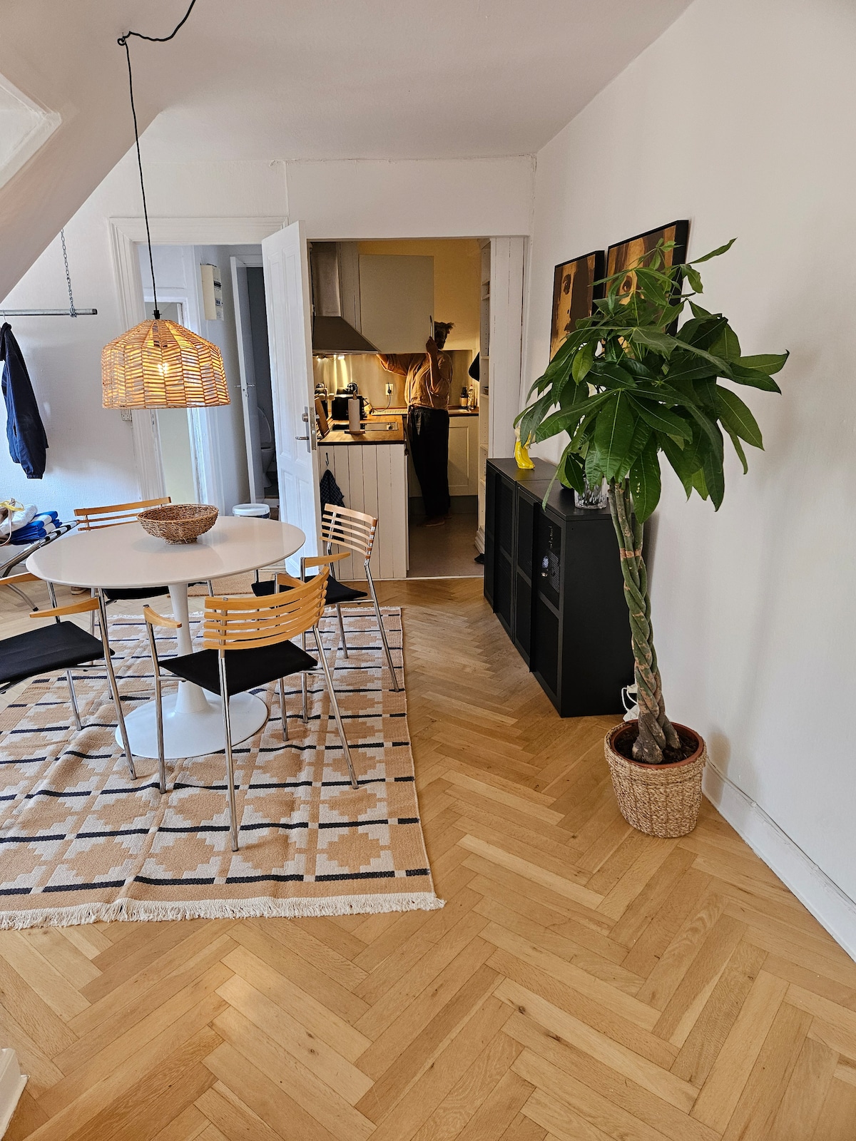 My apartment is situated on the third floor of a 300-year-old heritage building. It's important to note that, there is no elevator, which is common as less than 9 percent of buildings in Copenhagen's inner city have elevators. Keep this in mind if you have heavy luggage. My newly refurbished apartment features a hallway leading to the bathroom and a living room that opens to the sleeping area and kitchen. It offers a cozy (Hyggeligt) view of the city's rooftops.