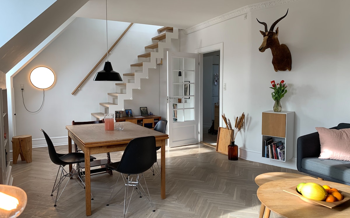 Lovely three bedroom apartment with a roof terrace and amazing views. In a listed building from 1860. It’s in the middle of Elmegade, a cosy boutiquestyle street full of winebars, cafes and lovely clothes shops. The flat is situated on the top and has wonderful views all over Copenhagen. It's very quiet and full of light. A perfect place to relax and rewind. There is easy access to public transport and walking distance to most sights. You will have a lovely time here.