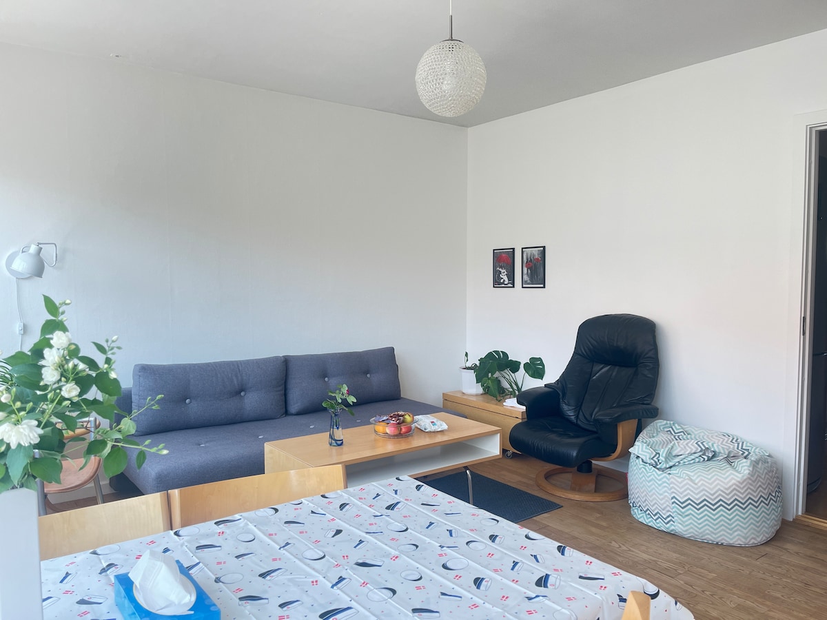 Nice apartment with two bedrooms, new kitchen and livingroom. The doublebeds are 140x200 cm. There is one extra bed in the living room. Wachingmachine, bathroom and seperat toilet. 15 min. by buss to the citycenter. Busses goes every 5 minutes. Many grocery-stores nearby. Beach 1,5 km.