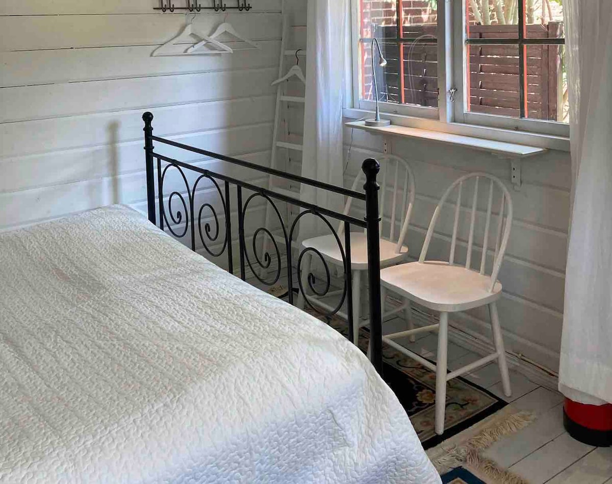 Her går vi meget op i rengøring. Hyggeligt et rums anneks på omkring 20km2. To dobbeltsenge, de kan laves til to sofaer. Lille hygge sofa. Tv. Mindre køkken til enkel madlavning. Mini ovn, mikroovn, koge kande, køleskab og køkken ting. Dyner og puder med sengetøj. Badeværelse og mindre gang til tøj og sko. Der er et romantisk varmt ude bad. Huset ligger lige ved bus 35 til lufthavnen. Det ligger kun fem minutter fra Idyllisk fiskerby med gamle gule huse og havn. Fin strand og badeanstalt.