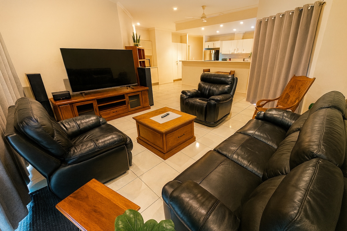 Two Bedroom Apartment with Laundry & Kitchen [Level -1, stairs access] Sleeps 4 people - A Queen Bed in each room [extra single available at cost] Aircon, Fan, 50" Smart TV, Full-size Fridge, Tea/Coffee, Desk, Wi-Fi, Linen & Towels, Hairdryer, Toaster, Kettle, Cutlery, Cooker, Microwave, Iron & Board, Two Seater Sofa, Tea & Dining Table, Vacuum Cleaner Housekeeping [Not weekends/holidays] Pet-friendly [fees apply] Pool & On-site restaurant. Need anything? Visit reception or call us 24/7.