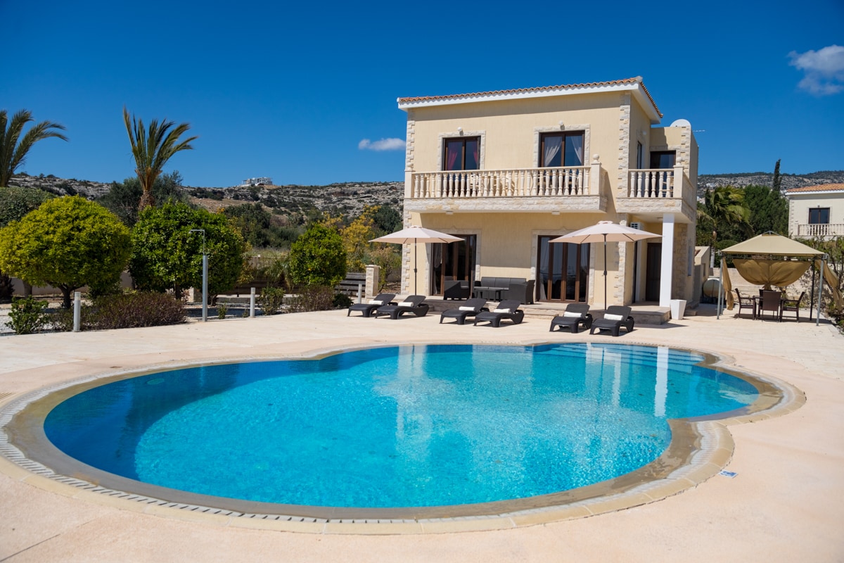 FULLY AIR CONDITIONED, spacious Villa (180m2) Very close to picturesque Latsi Marina/Akamas National Park/Baths of Aphrodite. Commands great views of the Mediterranean sea, the Troodos mountains and the Akamas National Park. Restaurants and bars are two minutes drive away. Stands on its own fenced grounds, in a serene environment. Comfortable furnishings, private swimming pool, spacious terrace. Ideal for couples/families. Rental includes air conditioning and all local taxes.