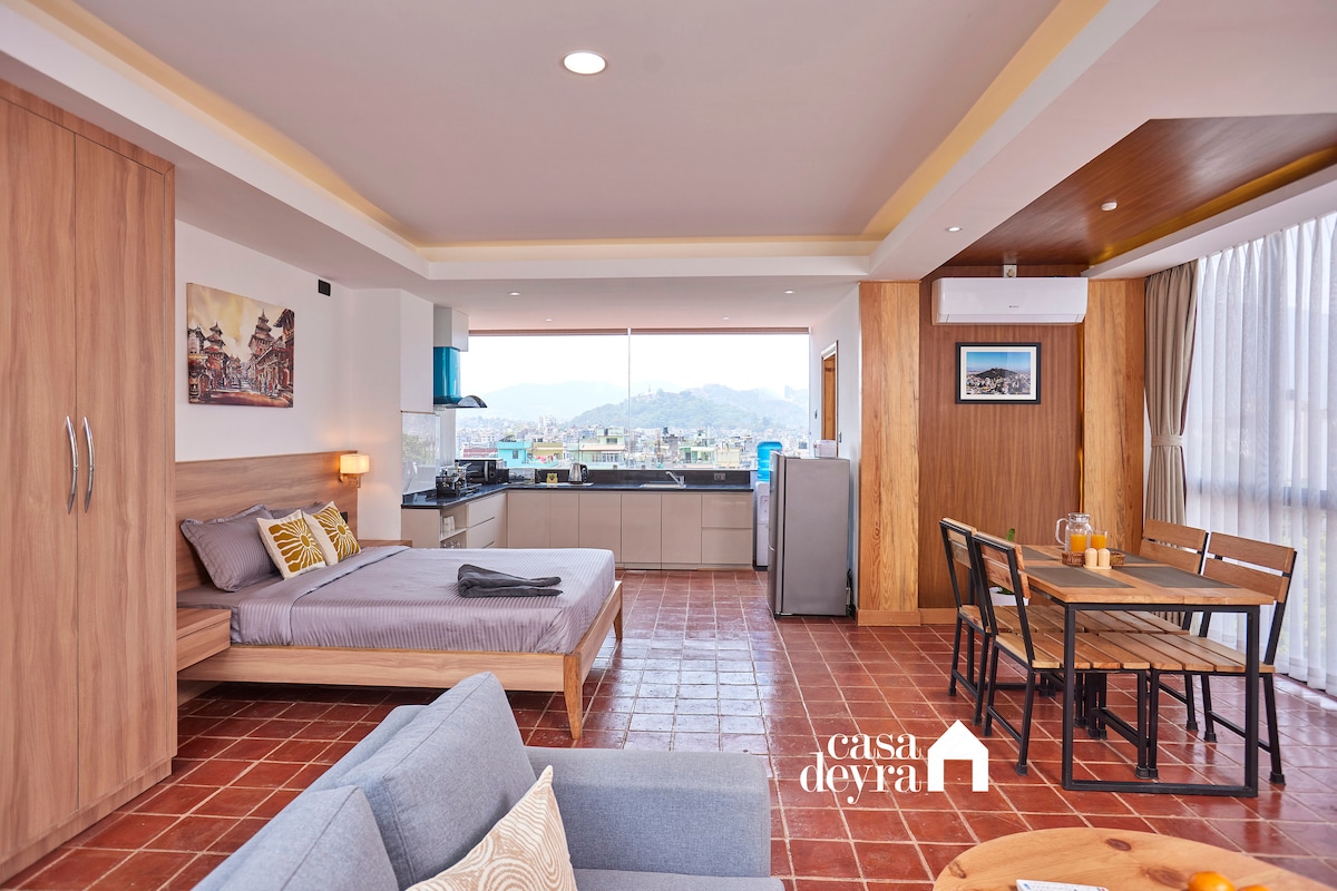 Wake up to Himalayan sunrises in this bright and beautiful studio apartment, where floor-to-ceiling windows frame panoramic views. Located on higher floors for privacy, this unit offers a stunning view of the Swayambhu Nath through large windows, blending Kathmandu's urban energy with natural serenity. Enjoy modern comforts including a smart TV, air conditioning, and a kitchen with premium appliances.