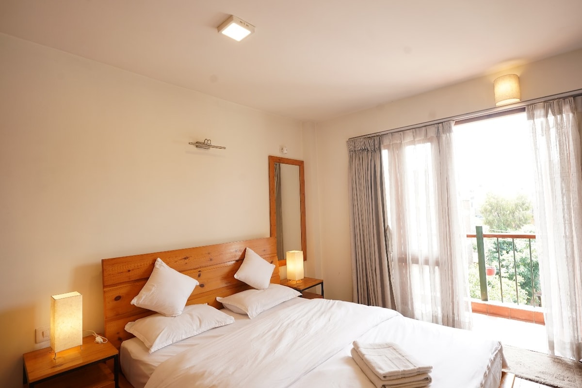 Wake up to Himalayan sunrises in this bright and beautiful studio apartment, where floor-to-ceiling windows frame panoramic views. Located on higher floors for privacy, this unit offers a stunning view of the Swayambhu Nath through large windows, blending Kathmandu's urban energy with natural serenity. Enjoy modern comforts including a smart TV, air conditioning, and a kitchen with premium appliances.