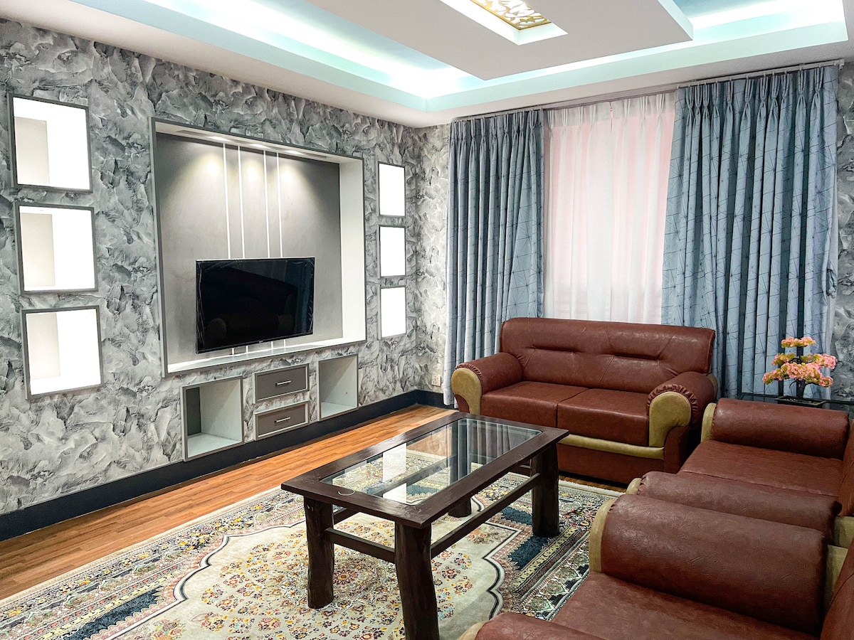 Fully furnished 3BHK modern apartment on 9th floor with a beautiful view, has all the necessary amenities & everything you need in the locality. The apartment is located in a very tranquil location just 1.5 km outside ring road of Kathmandu located in Dhapakhel keeping you away from all the dust & dirt of the city. The apartment is huge which has 3 bedrooms, 2 bathrooms, living room, dining room, kitchen & 3 balconies (2 in bedrooms & 1 in sitting room). Please message us for availability.