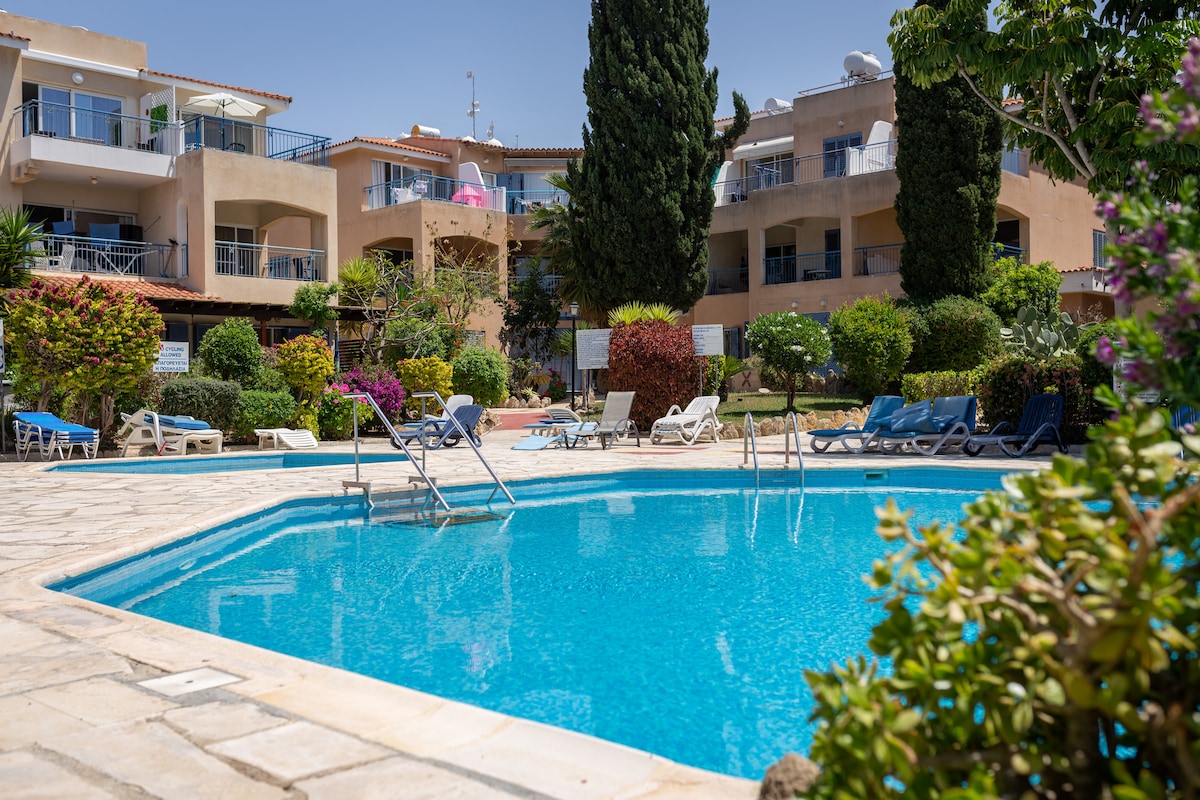 "To spitaki" * Newly decorated 2 b\room (2 floor) maisonette with private parking & driveway, patio, very close to the best Paphos municipal "blue flag" beach approx. 200 m, a mini market, a pharmacy & restaurants. The nearest bus stop is 300 m away. Only a 15-minute walk to the picturesque Paphos Harbour with shops, cafes, bars& tavernas. Fantastic and very convenient location. Ideal for beautiful walks near the beach. There is a new 2km long walkway ! *spitaki in greek means little/cute house