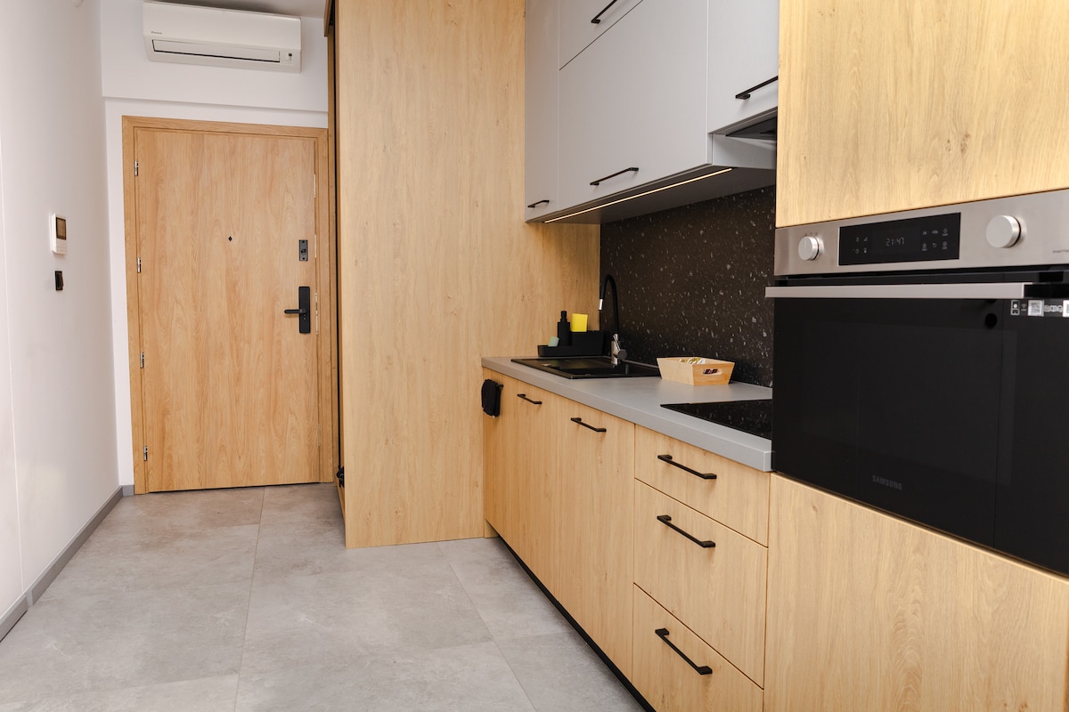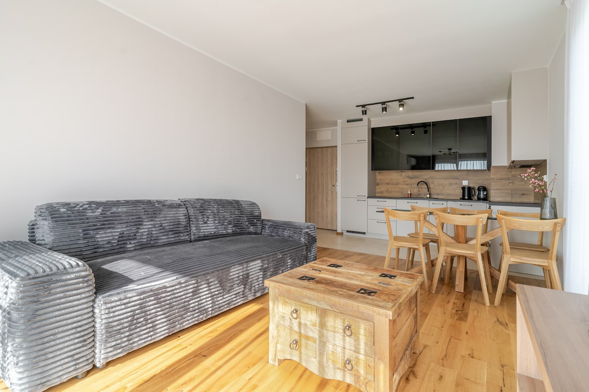 Two-room comfortable, air-conditioned apartment (45 m2) designed by an architectural firm in a modern boho style 🏡 - Bedroom with a double bed & designated workspace - Living room with a double sofa - Kitchenette with all the essentials including coffee machine & milk frother so that you can have your morning cappuccino - Bathroom with a shower, bidet, washing & drying machine and all the bath essentials - Balcony - 600 Mb/s Wi-Fi - Free parking space in the underground garage