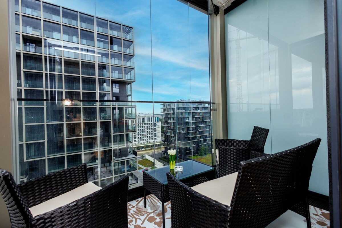 Sunny, comfortable apartment in the First District. Breathtaking 10th-floor view! Over 100m2 space (including 20m of terraces) - 2 private lockable bedrooms for sleeping and work, plus 2 more sleeping spots in the living room. Perfect for singles, couples, and business travelers with or without family. Excellent location near Spodek, NOSPR, and the Congress Center. Building features a convenience store, barber, Thai massage salon, Wine Taste by Kamecki.
