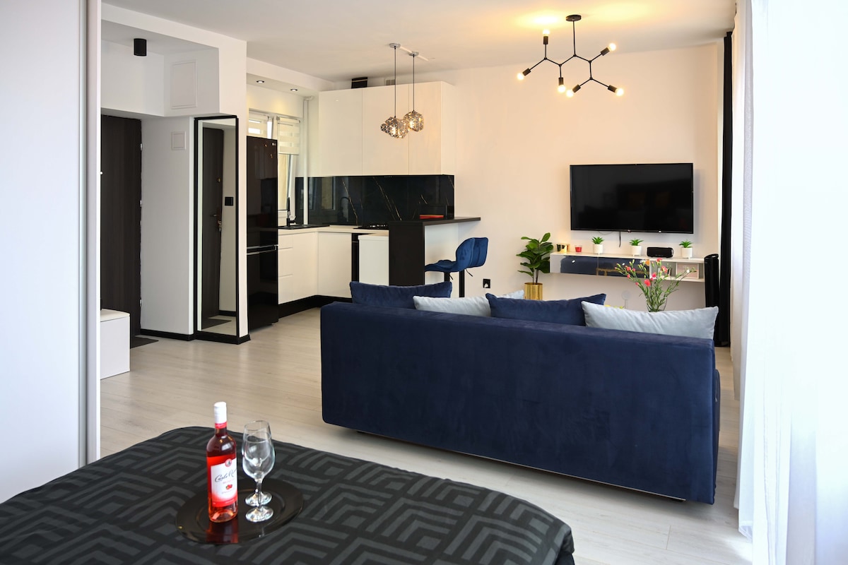 Sunny, comfortable apartment in the First District. Breathtaking 10th-floor view! Over 100m2 space (including 20m of terraces) - 2 private lockable bedrooms for sleeping and work, plus 2 more sleeping spots in the living room. Perfect for singles, couples, and business travelers with or without family. Excellent location near Spodek, NOSPR, and the Congress Center. Building features a convenience store, barber, Thai massage salon, Wine Taste by Kamecki.