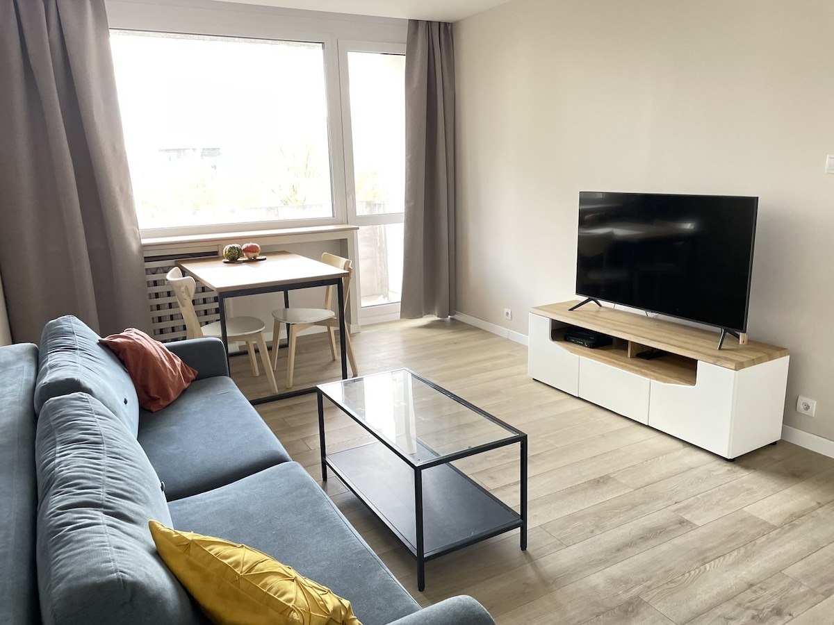 Two-room comfortable, air-conditioned apartment (45 m2) designed by an architectural firm in a modern boho style 🏡 - Bedroom with a double bed & designated workspace - Living room with a double sofa - Kitchenette with all the essentials including coffee machine & milk frother so that you can have your morning cappuccino - Bathroom with a shower, bidet, washing & drying machine and all the bath essentials - Balcony - 600 Mb/s Wi-Fi - Free parking space in the underground garage