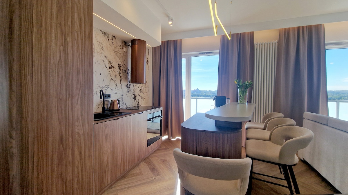 Silesia City View to wyjątkowy apartament na 14. piętrze z panoramicznym tarasem i wanną przy oknie z widokiem na gwiazdy. Prywatna sauna, klimatyzacja i nowoczesny wystrój tworzą oazę relaksu ponad miastem. Na 3. piętrze czeka zielone patio, , a w budynku eleganckie lobby z ochroną. W kompleksie, zaledwie kilka kroków dalej, znajduje się restauracja Meet & Eat. To coś więcej niż nocleg – to przestrzeń, która uruchamia wyobraźnię i koi zmysły.