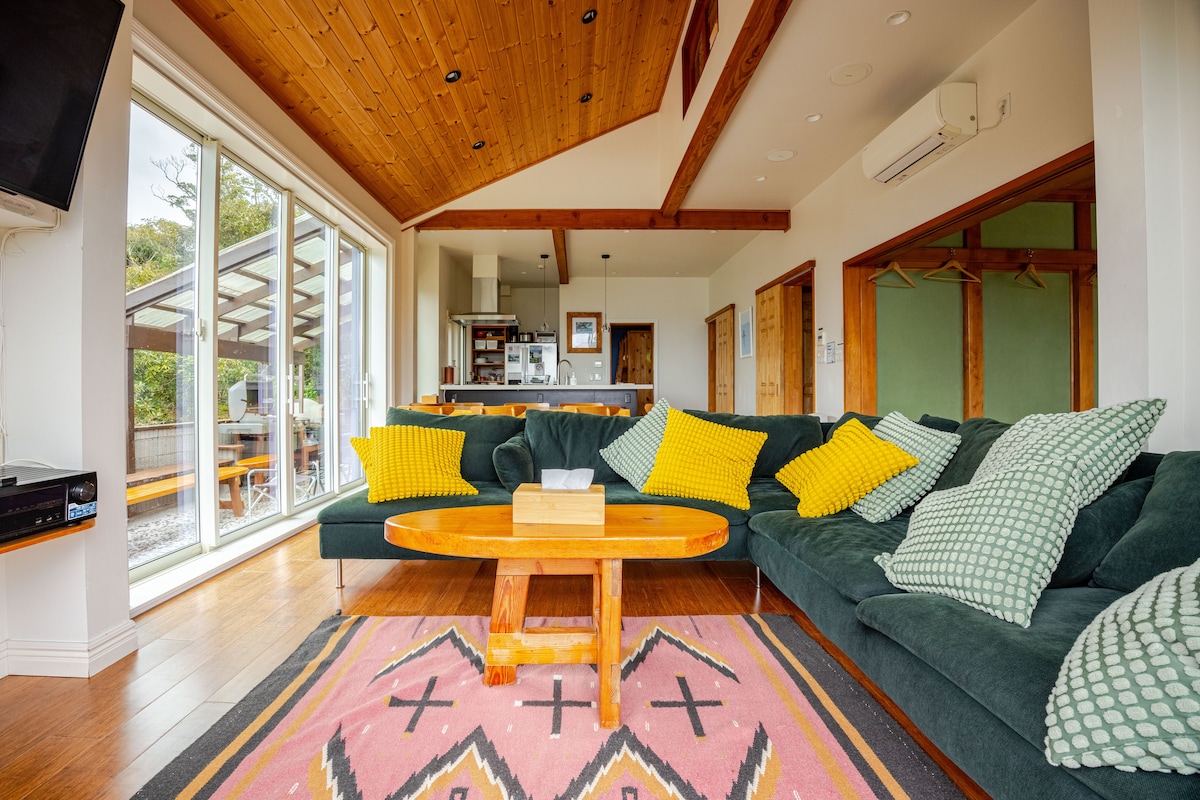 Welcome to “THE HILL Katsuura” – a serene log house , nestled in the forest with stunning panoramic views from a hilltop terrace. This spacious, single-story home is perfect for families, seniors, and guests with pets. Enjoy a covered BBQ, bonfire nights under the stars, or movies by the wood stove. With 3 bedrooms, full amenities, kid-friendly features, and barrier-free options, it’s the ideal blend of comfort, nature, and style for your next coastal escape.
