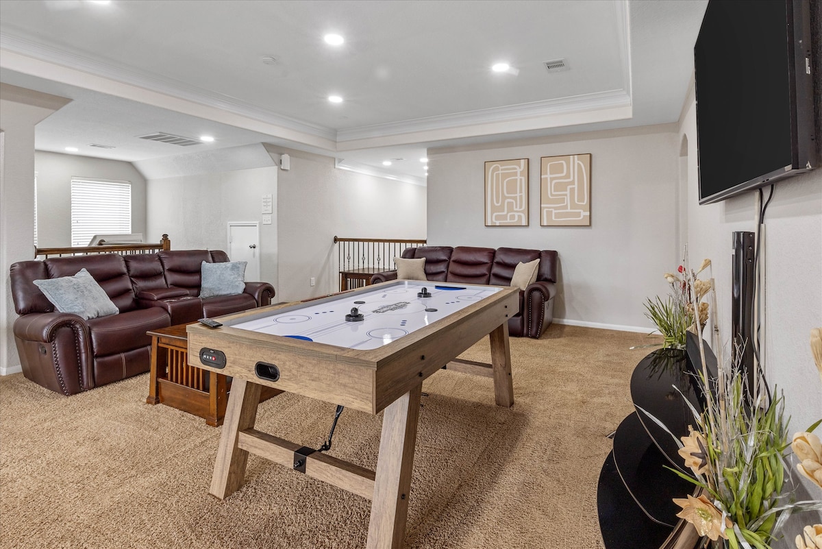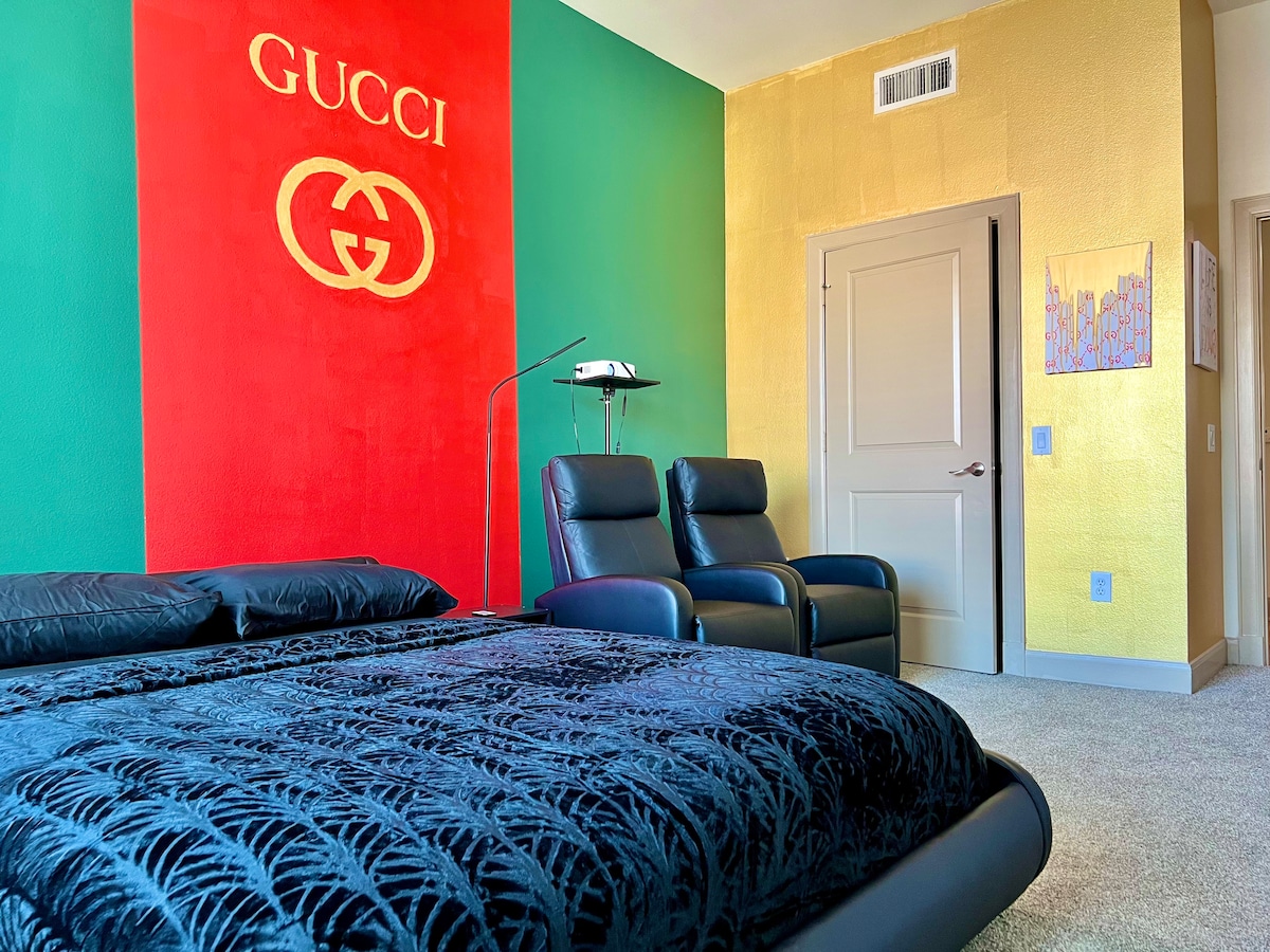 Kick back and relax in this fun, stylish space. The lights and clouds transform the space at night. Plenty of picture opportunity’s throughout the space. Watch a movie in the Gucci Theater. Make a gourmet meal in the kitchen. Relax on the patio in rocking chairs underneath the string lights, while listening to the waterfall from the pool. Unwind from the day in the King Size pillow top bed.