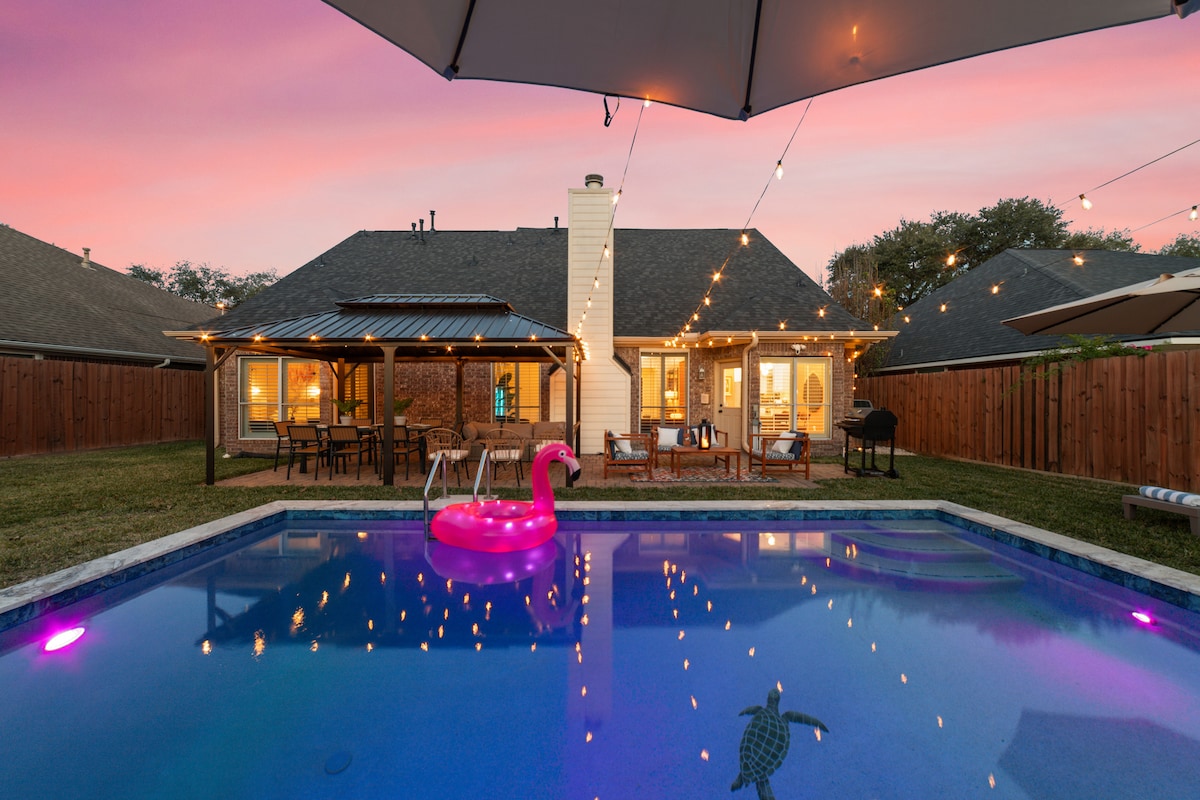 Experience luxury just 5 minutes from Katy Asian Town! Enjoy this 4-bedroom 2.5-bath home, with a game room with pool table, Luna+ cloud games, and board games. Outside, find an expansive pool surrounded entirely by artificial turf, mini-golf, cornhole, ping pong table, patio with a fire pit and BBQ grill. Located near Katy Asian Town, Andretti Indoors Karting, PopStroke mini-golf, Typhoon Waterpark, and George Bush Park. Book now!