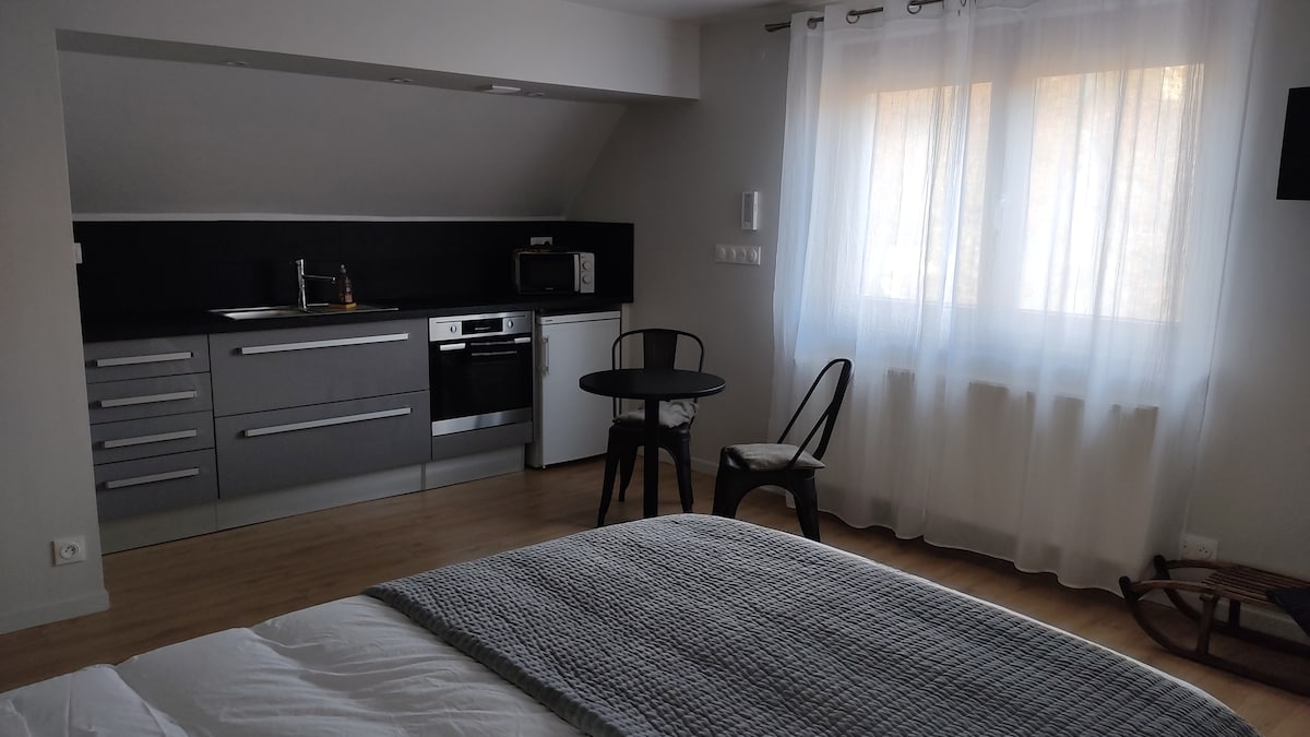 Nous louons une suite cosy, pour deux personnes, en r-d-c, dans une maison de village de 1789, en plein centre ville, et au calme. Nos équipements à votre disposition: Un Lit double Une Table Deux Chaises Une Salle de bain privative, avec douche, lavabo, et toilettes Téléviseur - Wi-Fi Assainisseur d'air Réfrigérateur Micro-onde Bouilloire Une machine à laver et un séchoir sont disponibles. Votre Entrée est autonome, via un boitier à code, qui contient les clés de la maison et de la chambre.
