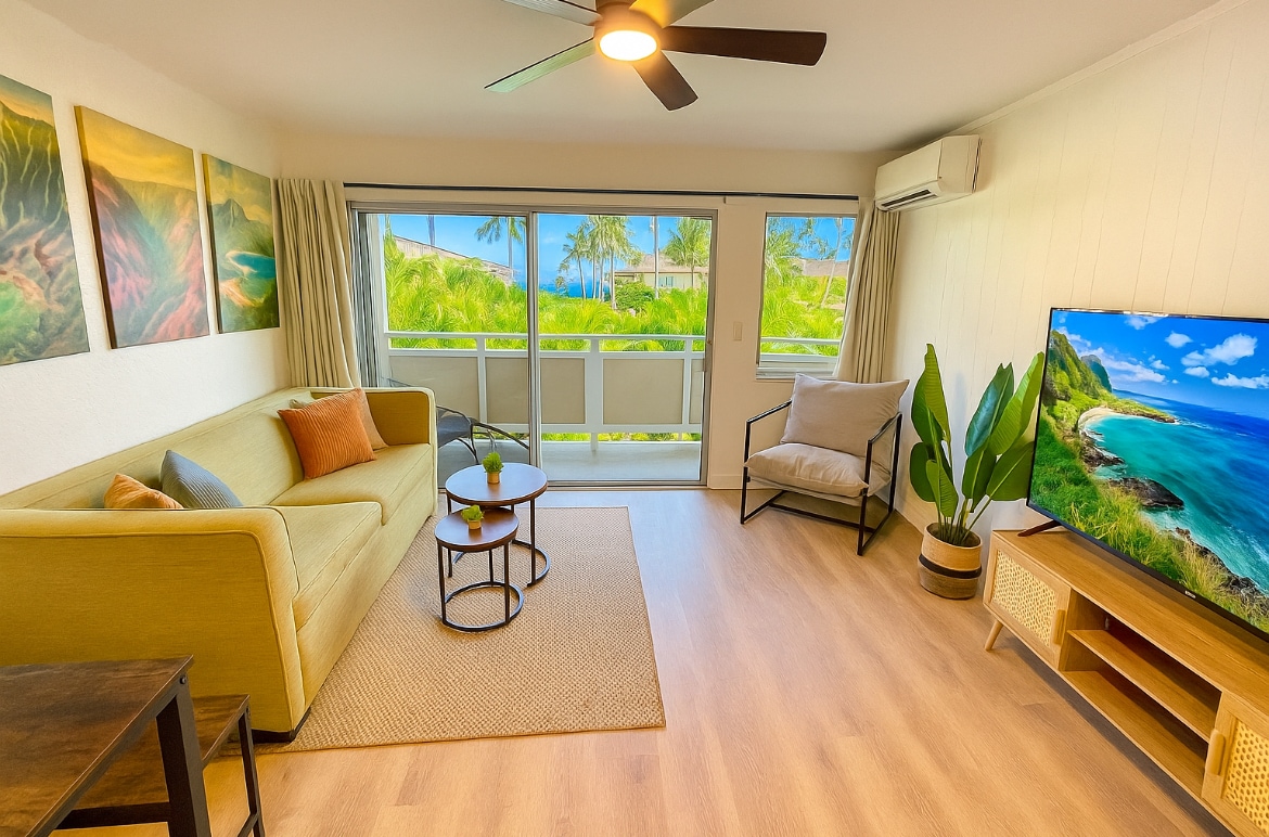 Escape to the heart of Kauai’s breathtaking North Shore and experience the tranquility of our tropical sanctuary. Nestled within the prestigious Princeville community, this private two-bedroom retreat is designed for relaxation and rejuvenation, combining modern elegance with the natural beauty of island living. The open-concept living area, with floor-to-ceiling glass, offers lush tropical views. Whether savoring your morning coffee or unwinding in luxury, this is your perfect island escape.