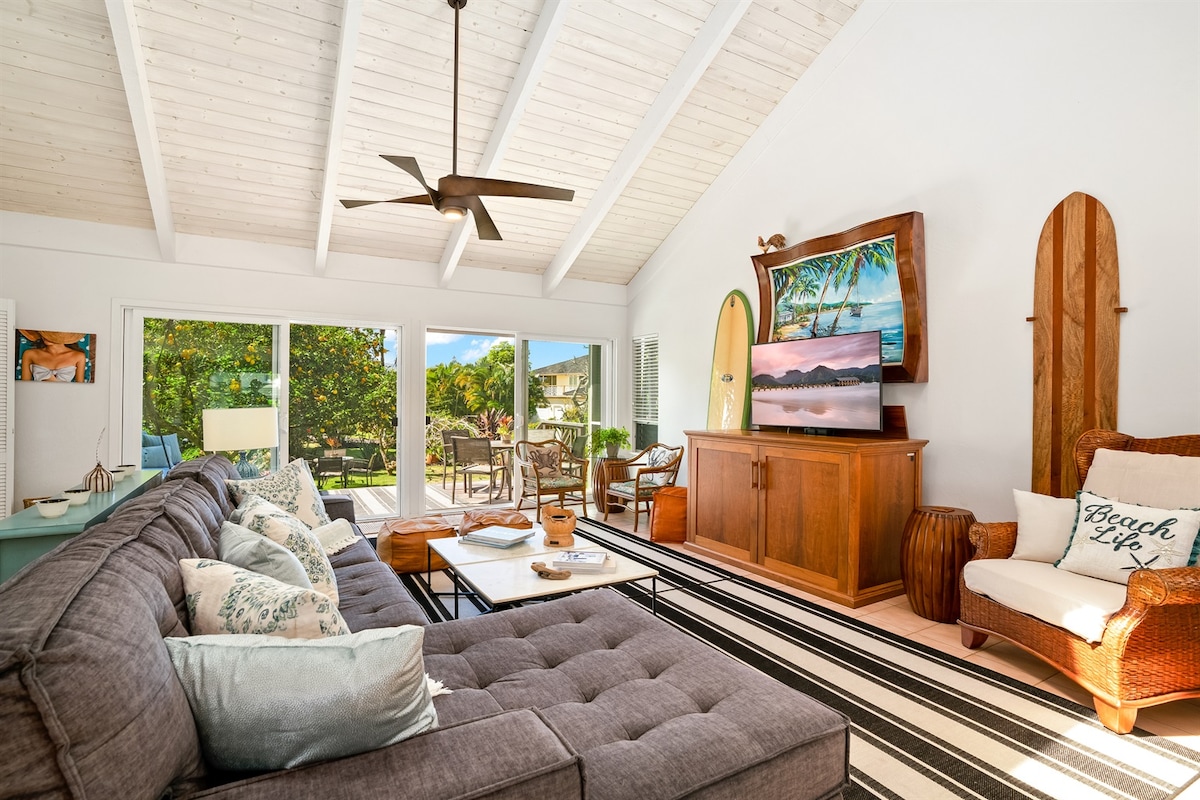 Escape to this private Hawaiian paradise, tucked away in a family friendly neighborhood minutes from Hanalei. Walking paths to shops, beaches, outdoor markets, cafes and grocery store are out the front door. Mornings on the lanai promise bird songs and tranquility as you sip your coffee or maybe you'll catch a few waves at Hanalei Bay before breakfast. Evenings dazzle here as you unwind and relax under twinkling cafe lights. You'll come for the beach but you'll stay for the rainbows.