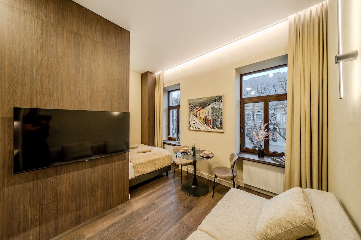 CENTRAL PARK APARTMENTS - brand new 2024 designer made apartments, located in heart of Kaunas city centre, while at the same time bounded by a beautiful Kaunas city central park with windows facing inner courtyard which ensures your calm sleep All restaurants, bars, clubs, shops and etc, right by the door Comfortable double bed with hotel grade mattress (+extra on top), a sofa-bed, fully furnished kitchen, air conditioning, washing machine with a drier, TV, NETFLIX EV charging statation - 50m