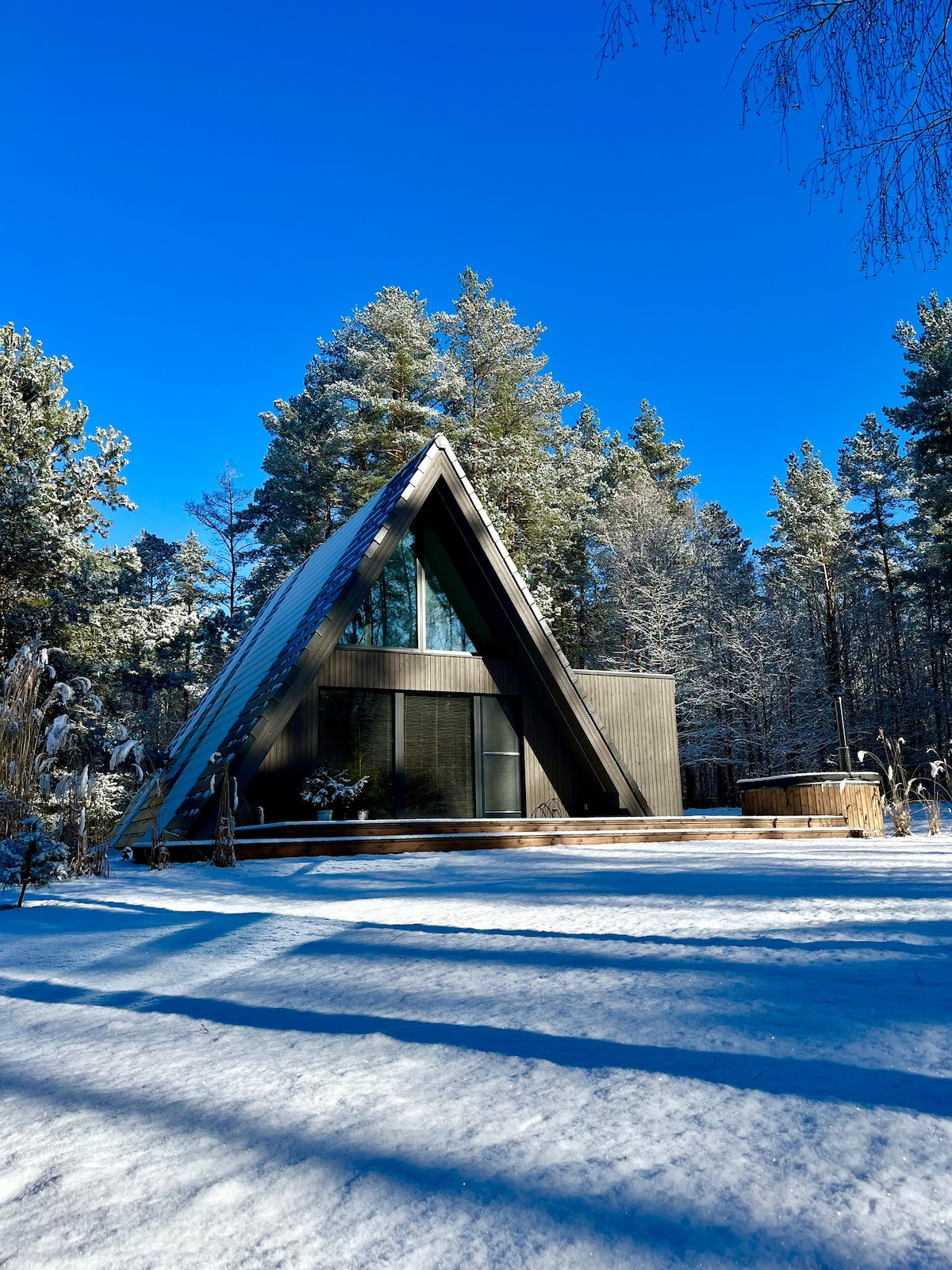 Mulberry House A2 is a cozy A-frame cabin designed for two, nestled in a peaceful orchard near the lakes and rolling hills of the Stakliškės–Aukštadvaris region. The cabin includes one bedroom, a private bathroom with shower, air conditioning, underfloor heating, Wi-Fi, and a small kitchen with a stove and fridge. Enjoy a private terrace for morning coffee or stargazing, plus a grill & chill zone. Perfect for a romantic weekend or a longer stay in nature – with comfort always close at hand.