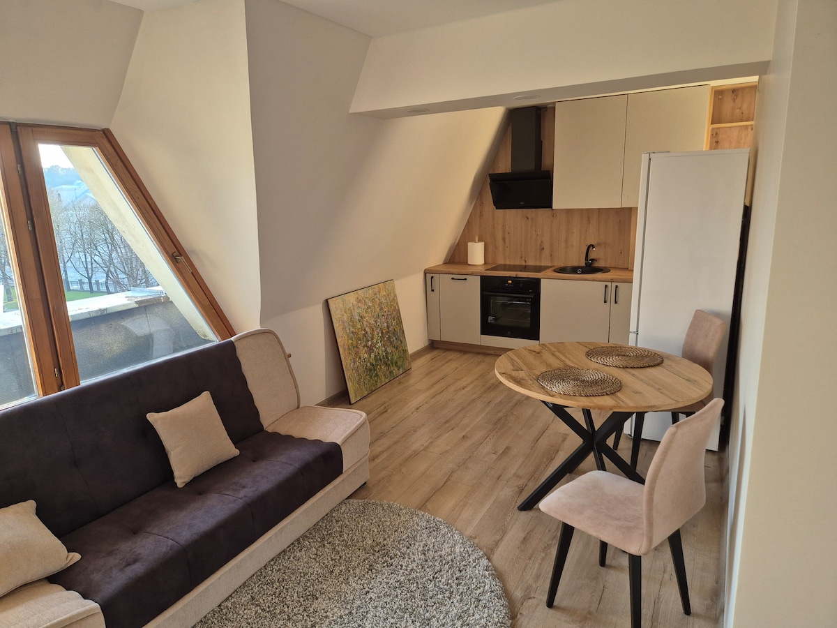 It is a loft type studio apartment located in the centre of the city. The apartment is in one of the most beautiful renovated historical buildings in town, used to be a Telegraph building. All the windows of the apartment are to the south side looking in to a beautiful church of Soboras. No main street noises. Just outside the apartment you can find a public transport stop. Shops and restaurants are in the walking distance less then 5min. away Apartment has a free parking, TV, internet.