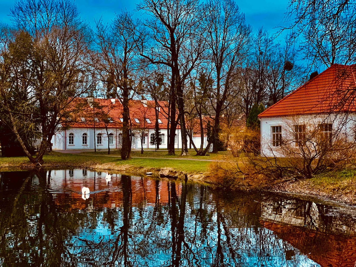 A charming newly rebuild Loft in a former Fredas Manor Guest house from 19th Century at the footsteps of Botanical Garden. Non smoking place can host 2+2 extra guests: sleeping area with double bed upstairs and sofa bed on the first floor. It has fully equipped kitchen, bathroom/shower. Free parking, free Wi-Fi, smart TV. Bus stop, grocery store, car, bike rental CityBee within 800 meters. City Center, Old town, Kauno Zalgiris Arena, Train&Bus stations Shopping Center Akropolis within 2-3 km.