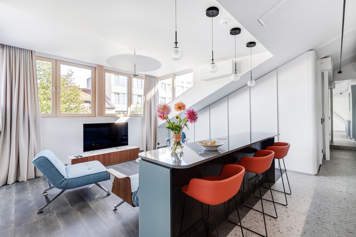 It's exclusive apartment! A spacious loft furnished by a well-known designer to make you feel cosy. Modern flat with french balcony is located on the 4 floor and accessible by elevator. Loft is equipped TV, kitchen equipment, air conditioner, washer. On the panoramic roof terrace, you can relax, have morning coffee or evening wine. Your daily trips don't require a car. City center, Žalgiris arena, museums, mall is within walking distance. There is paid street parking.