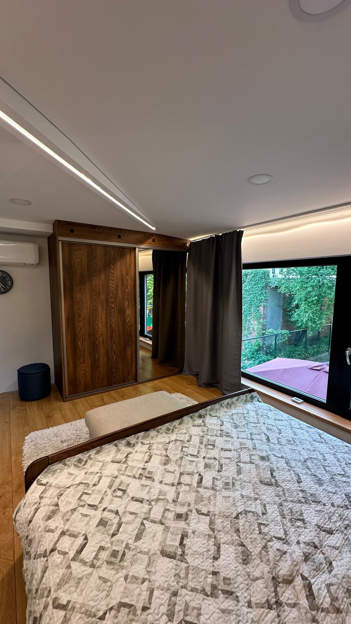 Spacious (80 sq.m.) and unique apartment with a ~35 sq.m. terrace, offering a panoramic view of the city of Kaunas. You will reside on the top floor, with no neighbors around. The apartment is located next to Kalniečiai Park. Also there is good access to Kaunas Airport. On the rooftop terrace, you will find a barbecue area and outdoor furniture. Inside the apartment itself: a fireplace, a large corner bathtub, a double bed, a stripper pole, a television and a fully equipped kitchen.