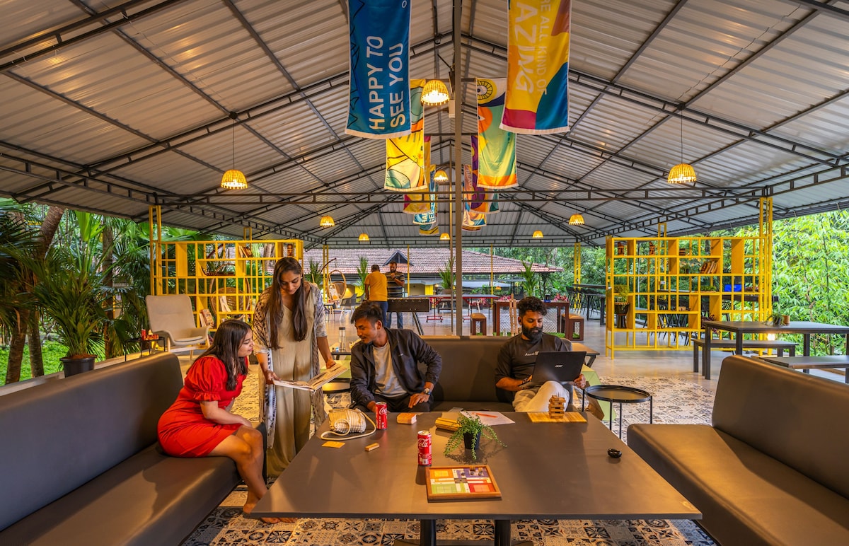 A premium private room with an ensuite washroom, a balcony seating area with a view, and AC. Concealed within a lush expanse of delicate coffee plants, pepper creepers, and shrouded jackfruit trees lies Zostel Coorg (Madikeri). Dipped in tranquillity, this traditional Kannada house is meant for interacting with nature and spending time with friends.