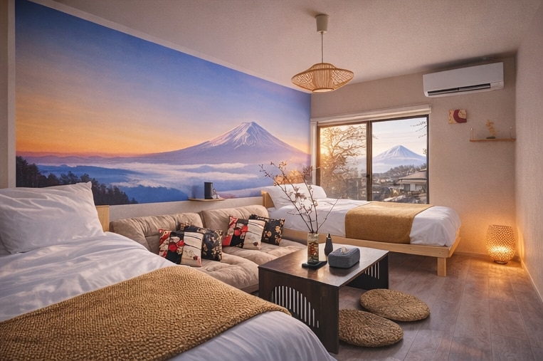 こんにちわ、Mickyです😄 河口湖駅から徒歩10分のアパートメントタイプの宿です。 アパート二階からの富士山の眺めはとても綺麗で、撮影スポットです☺️ コンビニ徒歩3分。 遊園地の富士急ハイランドも1駅でとても好立地。 部屋は私のこだわりで和室は桜柄の壁紙を天井まで張り巡らせました。さらに日本の伝統的な七宝柄や光が当たると金色に輝く壁紙もとても美しいですよ。畳を使った椅子や盆栽などのインテリアもあり、日本の【和】空間を存分に楽しんでいただけます。 部屋は4人まで宿泊可能です。 お子様用の食器や枕も準備しています。 ベッドは2メートルのとても大きなサイズで(2人)、畳にお布団を敷いて寝ることも可能(1人)。さらにおしゃれなソファをベッドにすることも可能。 日本の魅力を詰め込んだ室内と日本が誇る富士山を存分にお楽しみくださいね! ありがとう ※予約後、専用のシャワールームを案内します。また、シャワールームへ行くのに一度部屋の外に出て、隣の部屋へ移動する必要があります。少しだけ共用の廊下を通りますが、ほとんど他のゲストと顔を合わせることはないので、安心してください