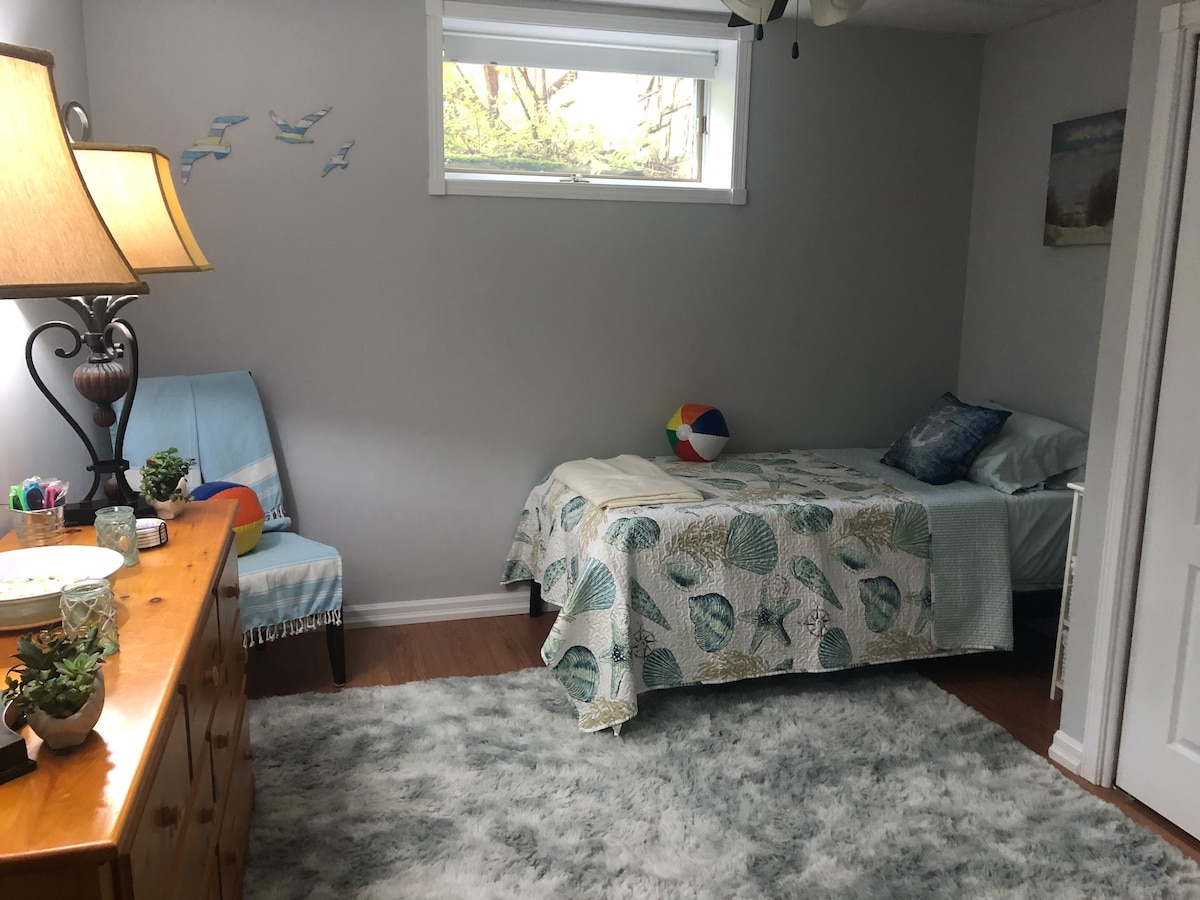 The Beach - a fun and unique room sets the stage for a memorable trip to the lake. Complete with luxury cot, beach balls, sunglasses and seashells! Shared bathroom with The Moon room. Minimum 2 night rental on its own or 1 night if rented in conjunction with another room of whole home. This room also doubles as our spa wellness sessions room in our newly opened lower level spa - The Sunflower Spa.