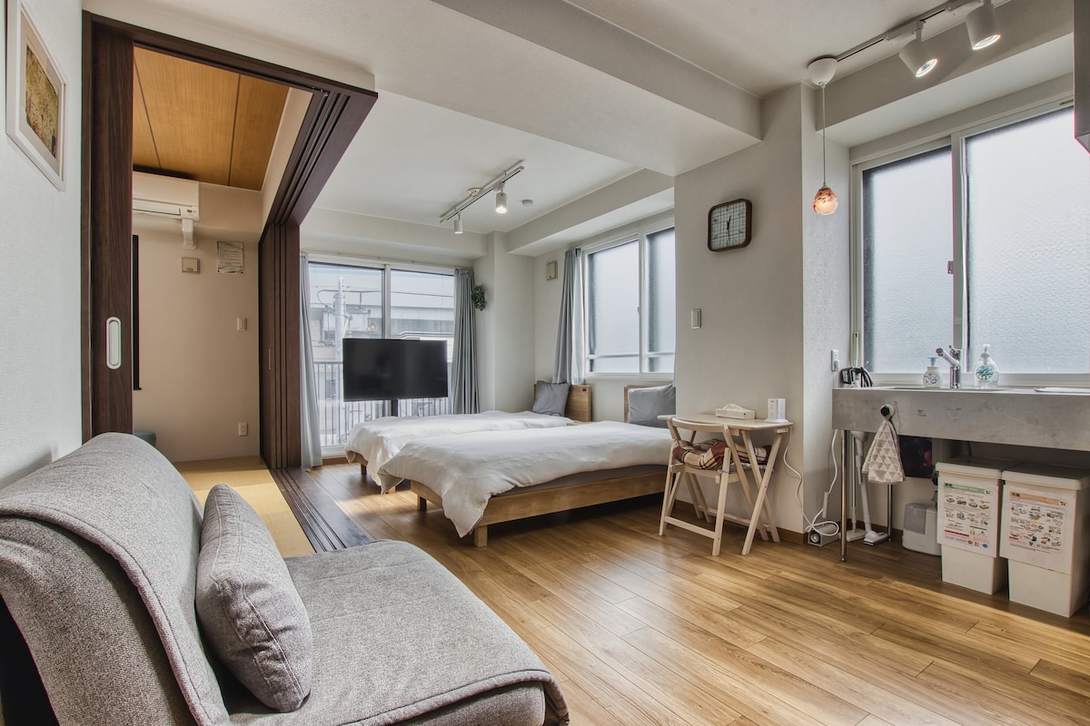 Discover authentic Tokyo in our spacious, family-friendly studio "Happy House 1C" in a quiet and safe residential area of Sangenjaya. ✨ Sleeps 4 with two double beds and a sofa bed. Features a full kitchen, high-speed Wi-Fi, and a powerful clothes dryer, ideal for longer stays. Just a 7-minute walk to the station and a quick 5-minute train ride to Shibuya. Surrounded by local shops, cafés, and restaurants, it’s perfect for families, couples, or friends seeking a stylish home base. 🌸