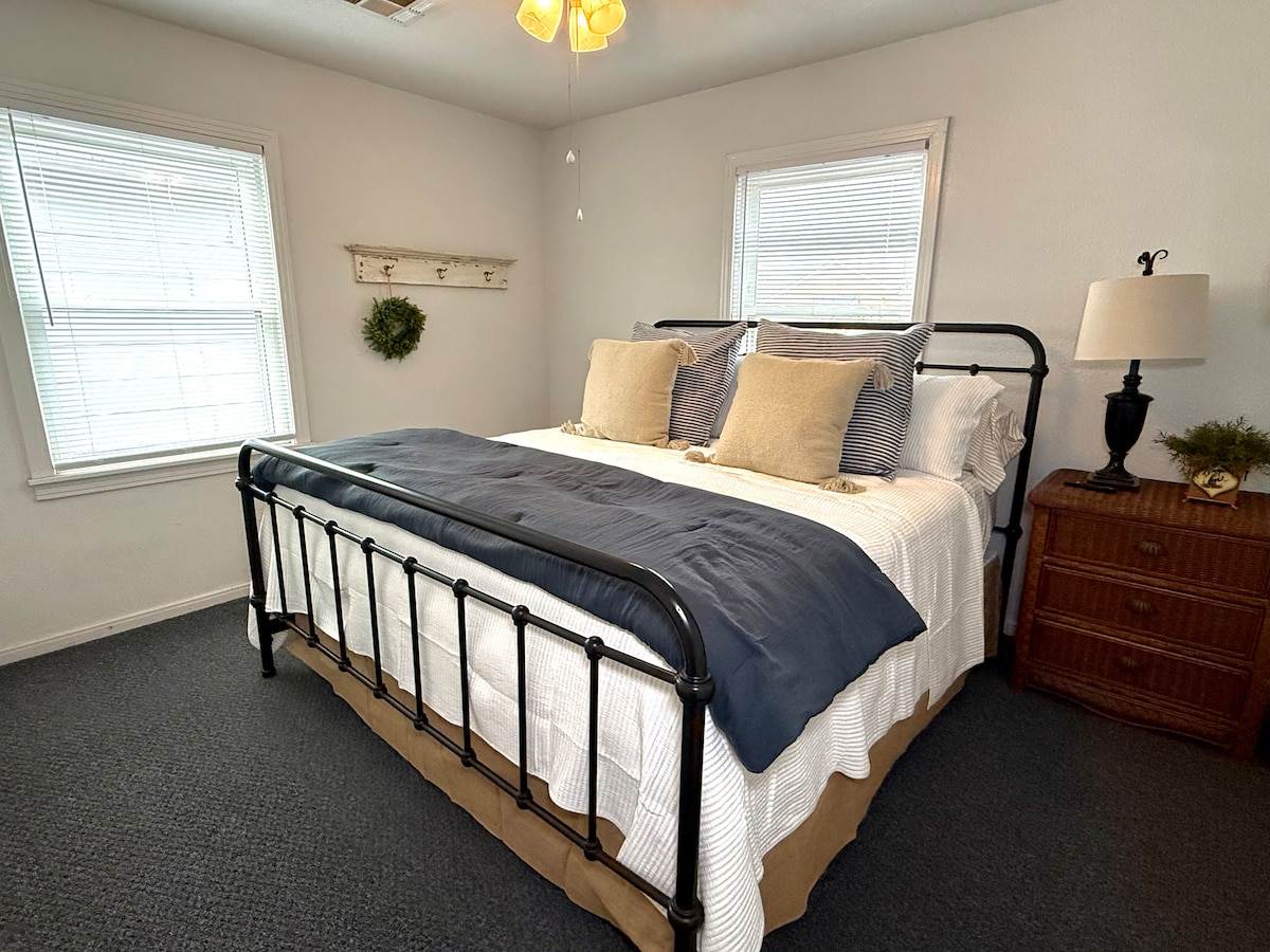 Kick back and relax in this newly remodeled modern retreat nestled on the quiet Ranchwood Park in Ponca City, Oklahoma. This home is ideally located in a family community and is directly across from Lake Ponca, making it the perfect peaceful family get away. This 3 bedroom home comfortably sleeps 4 adults and 2 kids; twin bunk beds in the kid room, a full size bed in the second bedroom, and a king in the master. There are 2 full baths, full size washer and dryer and a fully stocked kitchen.