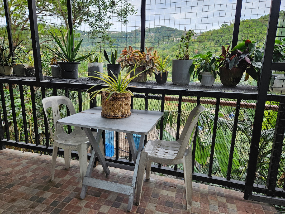 The Pine Nook is a cozy mountain getaway perfect for rest and relaxation. Savor the peaceful environment and cool mountain weather just 10 minutes from the hustle and bustle of Baguio City. This ultimate staycation has all the comforts of home : spacious bedroom area with a queen sized bed and a twin bed for your little or not-so-little one. The living area is complete with a comfy couch, smart tv with Netflix, small kitchen and dining area. You can even go down and enjoy the outdoor area.